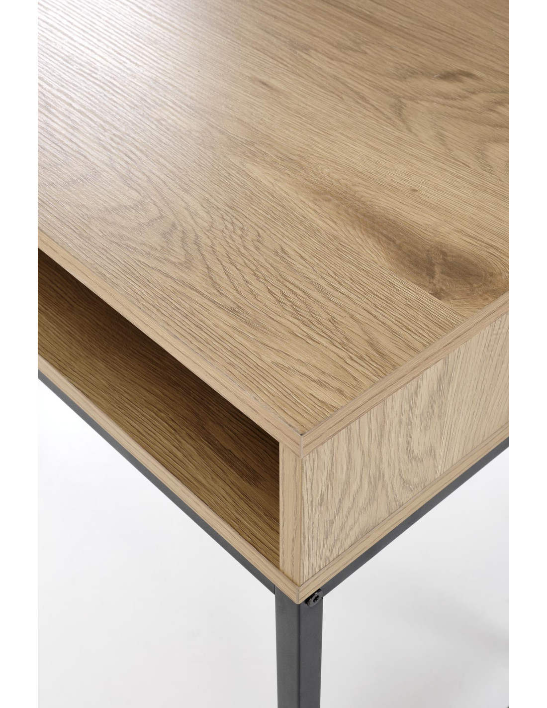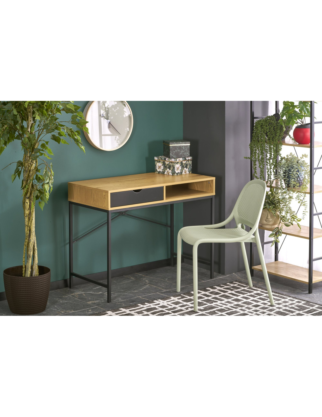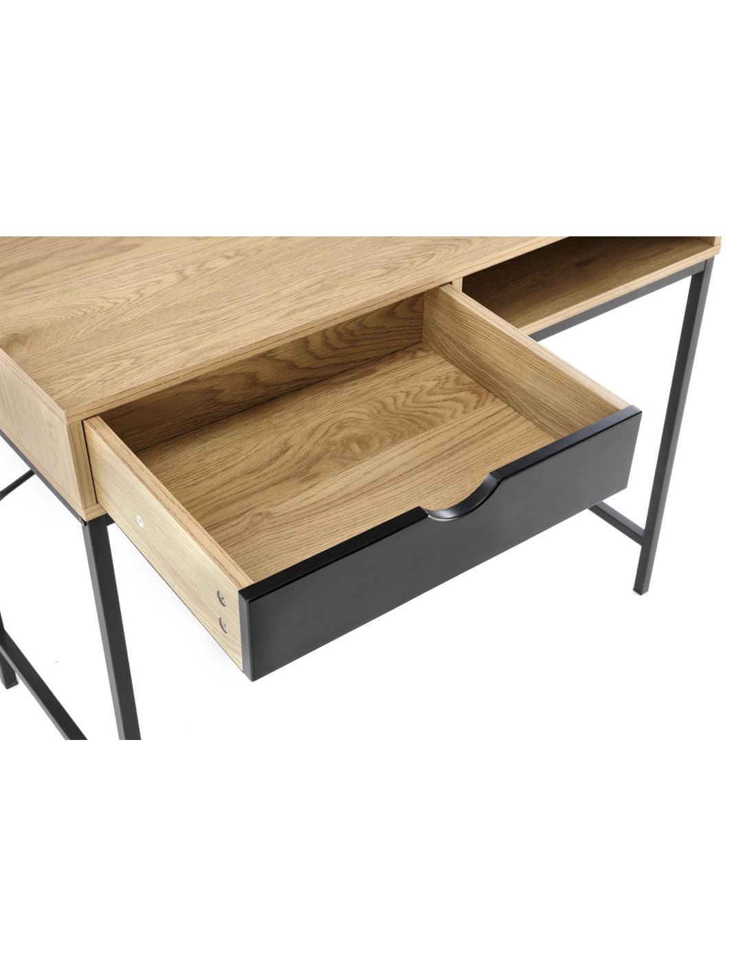 Biurko wyposażone jest w jedną szufladę z eleganckim czarnym frontem oraz otwartą półkę, która doskonale sprawdzi się na książki czy dekoracje. Dzięki krzyżującym się wspornikom, nogi biurka zapewniają dodatkową stabilność, co sprawia, że jest to idealne miejsce do pracy czy nauki.