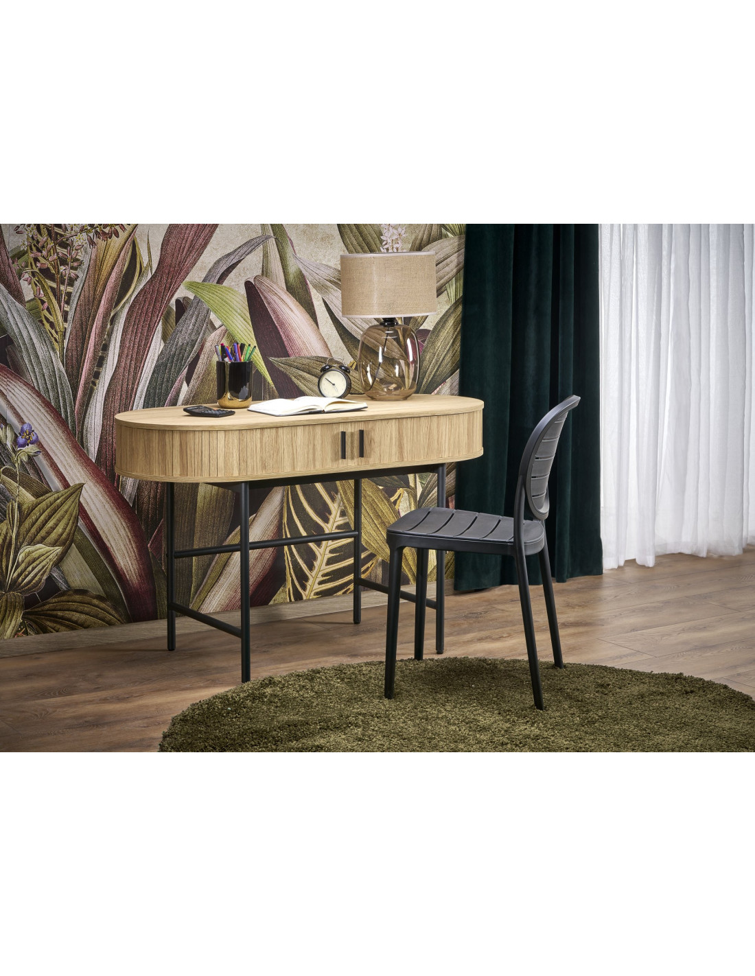 Biurko ma prostokątny kształt z zaokrąglonymi krawędziami, co sprawia, że doskonale wpasuje się w nowoczesne oraz skandynawskie aranżacje wnętrz. Regulowane stopki nóg umożliwiają dostosowanie wysokości, co podnosi komfort użytkowania.