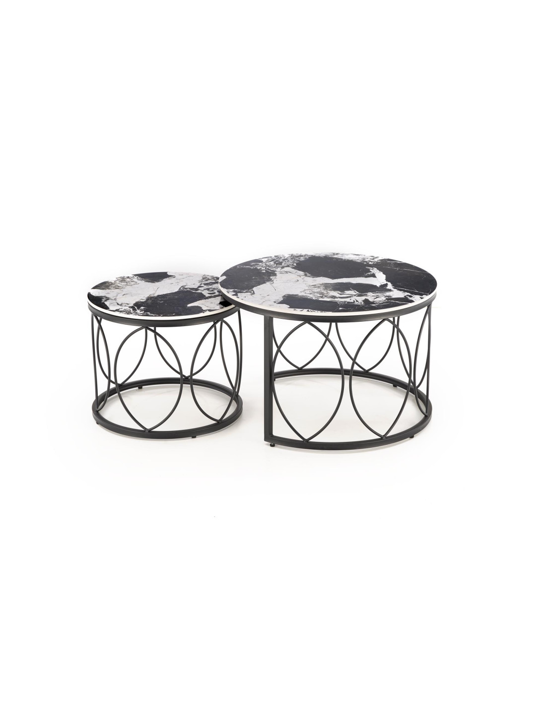 Dodaj piękny akcent do swojego wnętrza! Zestaw 2 ław ALEXANDRA to doskonałe połączenie eleganckiego designu z nowoczesnym stylem. Okrągłe blaty wykonane ze spieku imitującego czarny marmur z białymi żyłkami wprowadzają do przestrzeni nutę luksusu, a ażurowe metalowe stelaże w kolorze czarnym dodają lekkości oraz nowoczesności. Te ławy nie tylko pełnią funkcję użytkową, ale również stają się wyróżniającym się elementem dekoracyjnym każdego wnętrza.