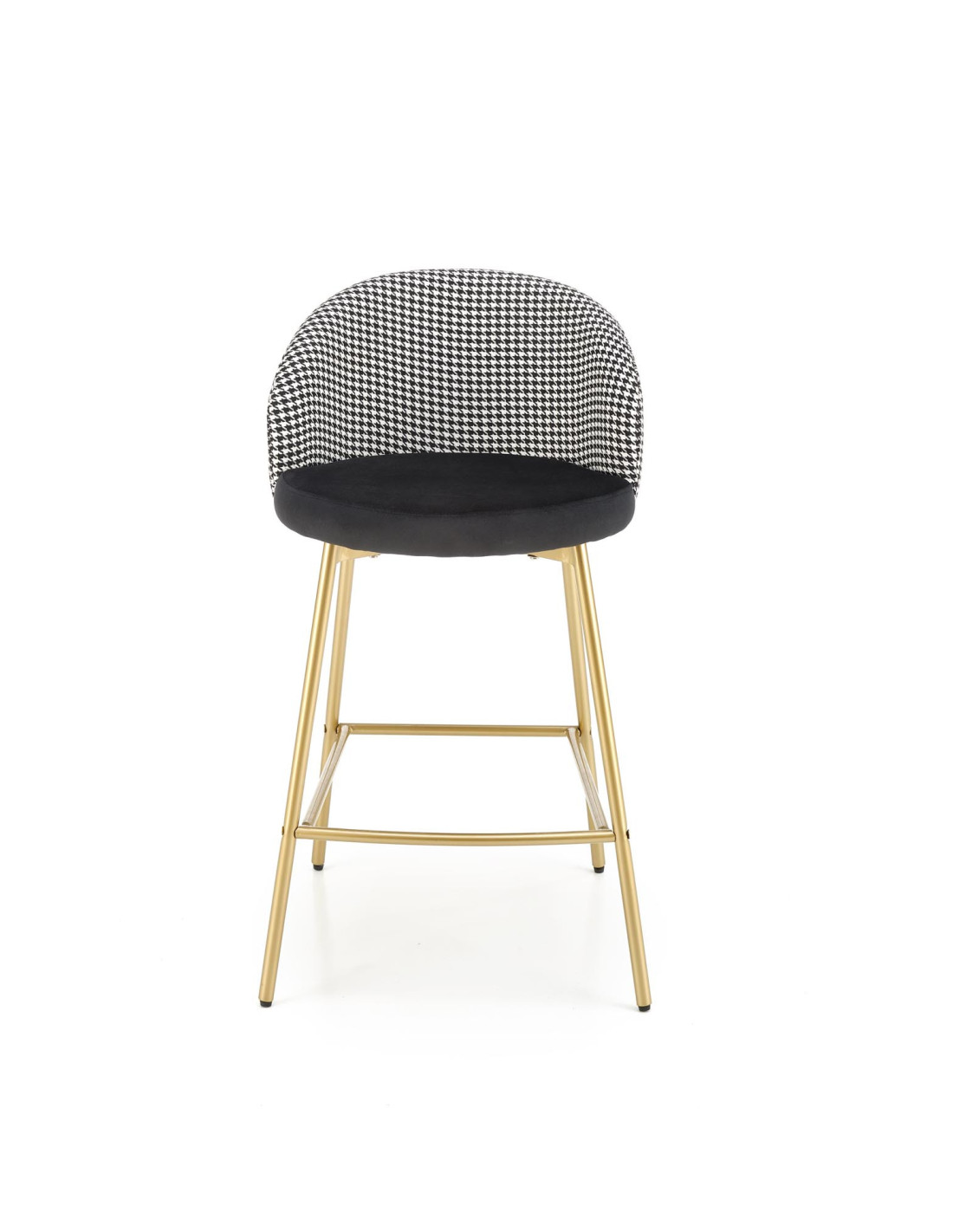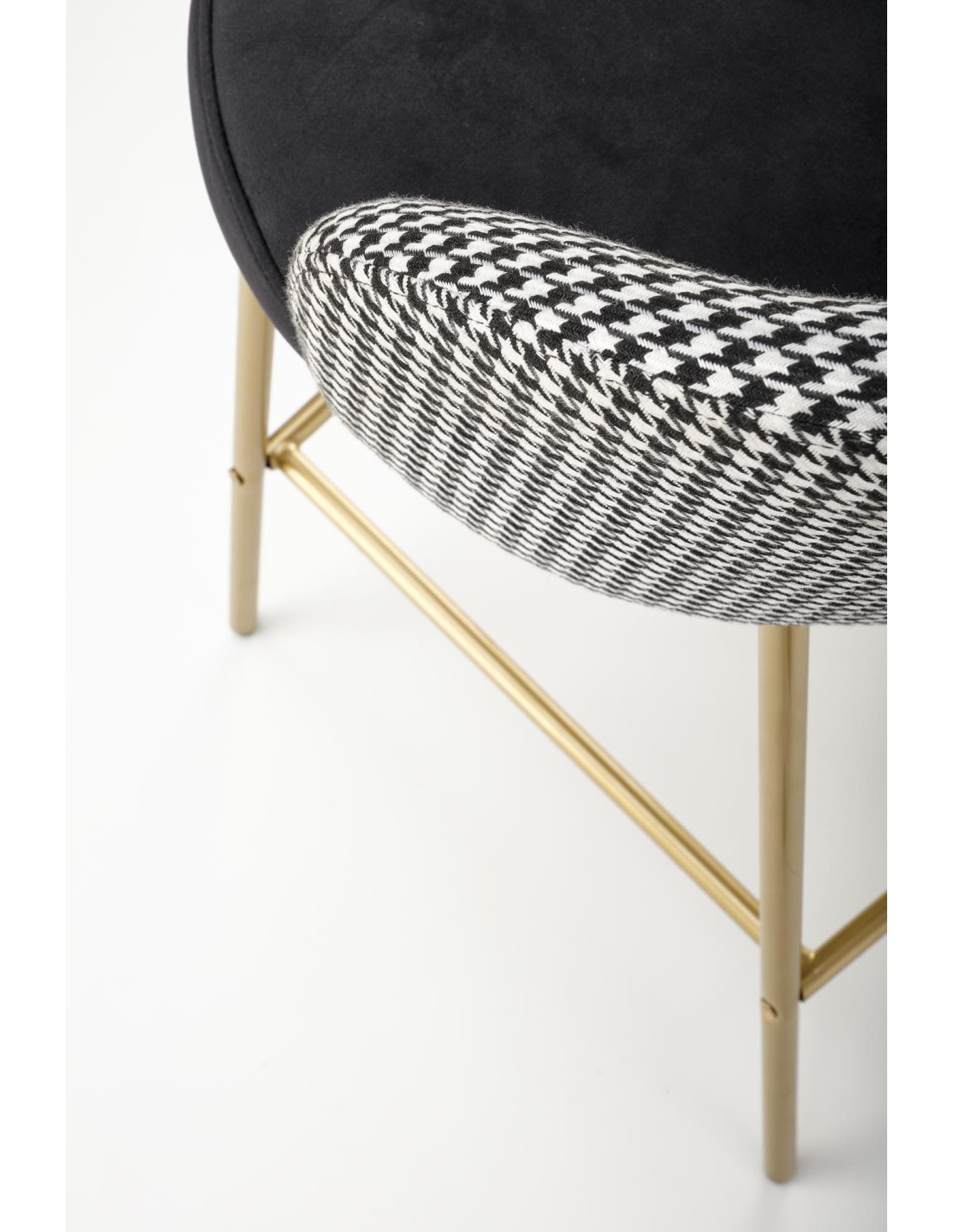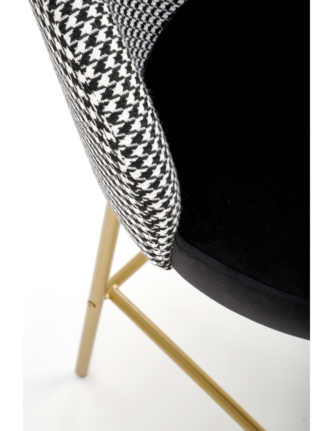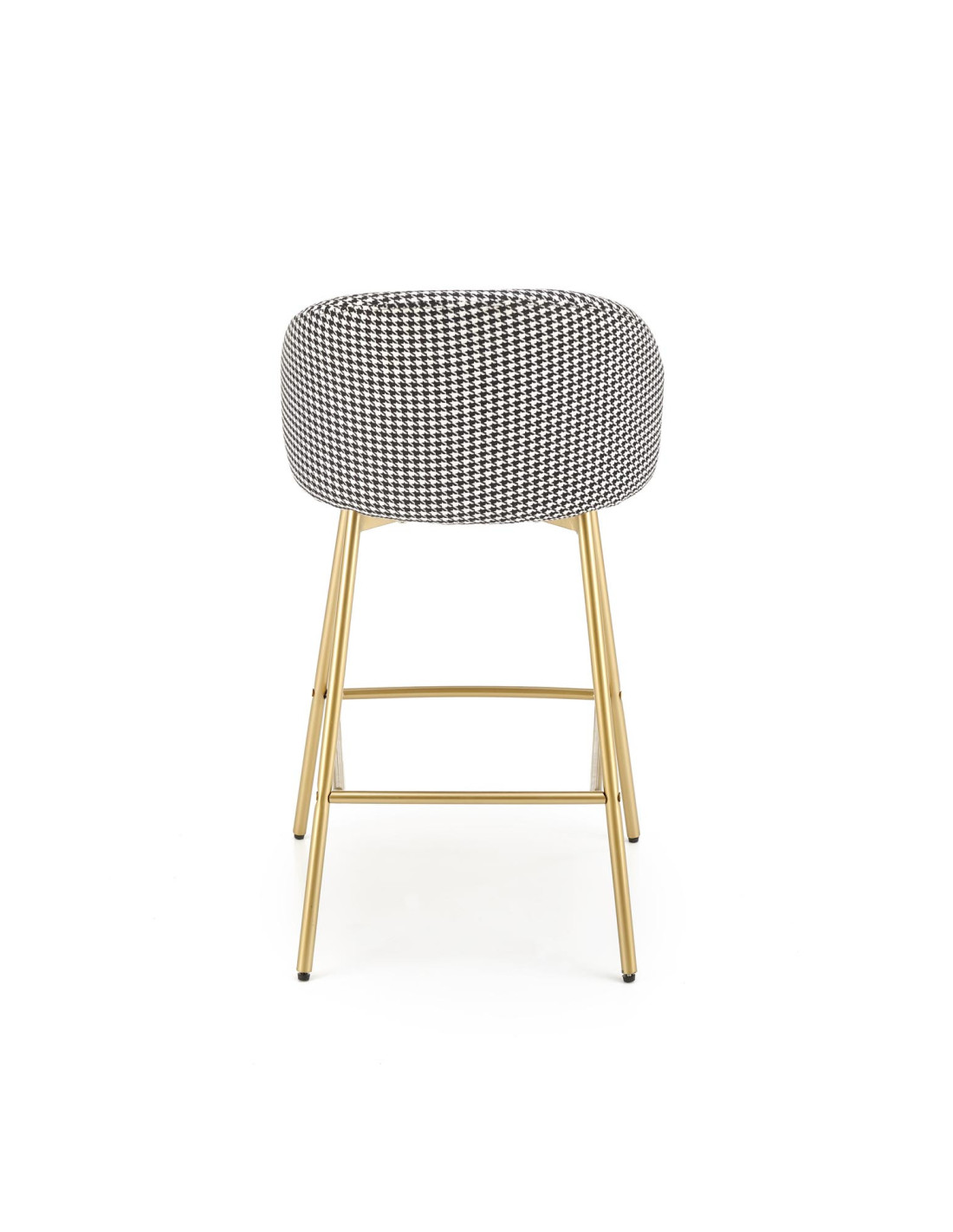 Nadaj styl swojemu wnętrzu z hokerem H113, który zachwyca nowoczesnym designem i eleganckim wykończeniem. Siedzisko tapicerowane jest miękkim materiałem w kolorze czarnym, co zapewnia wygodę podczas siedzenia. Oparcie z czarno-białym wzorem pepitki dodaje mu charakteru, a złote metalowe nogi stanowią nie tylko estetyczny akcent, ale także gwarantują stabilność.