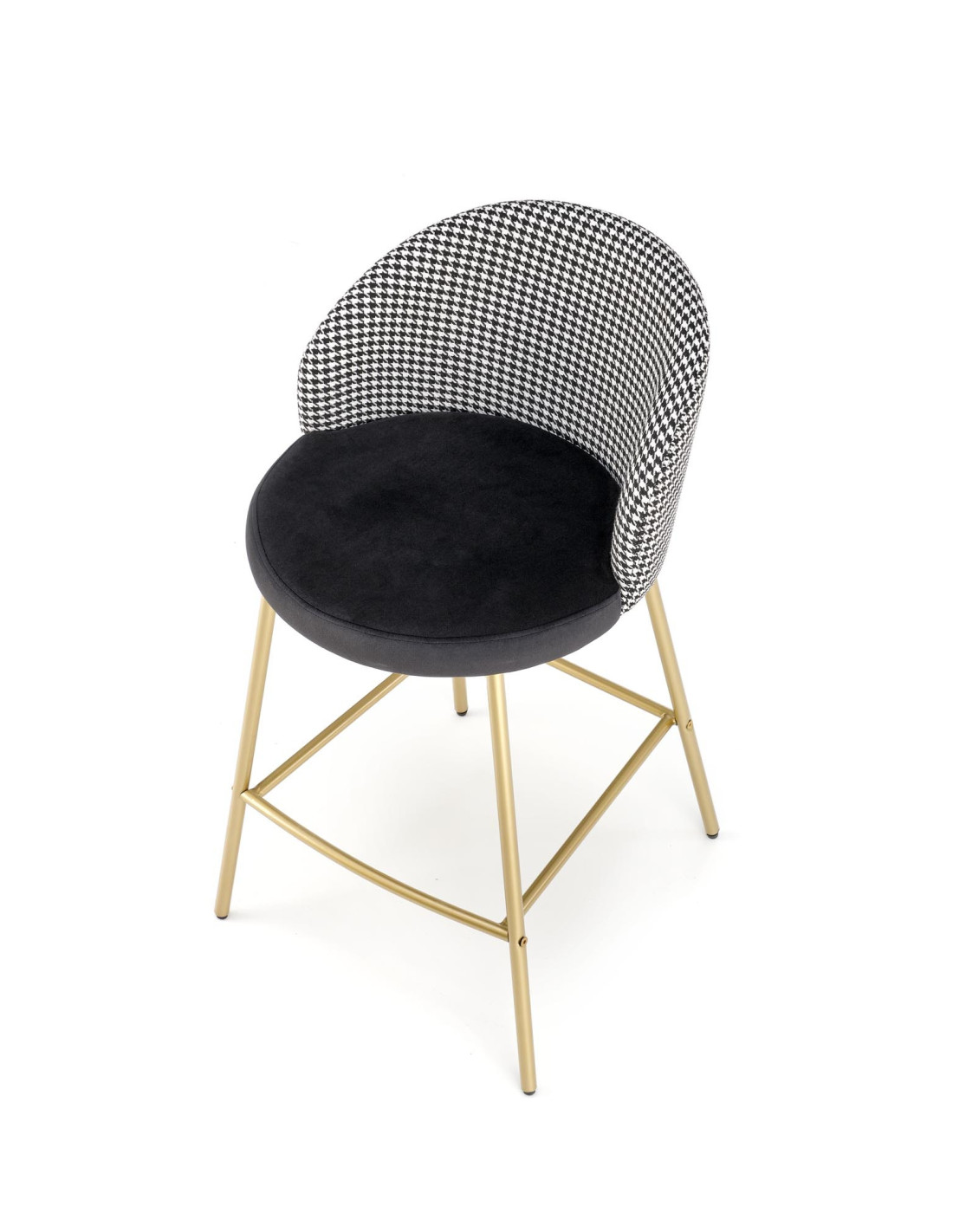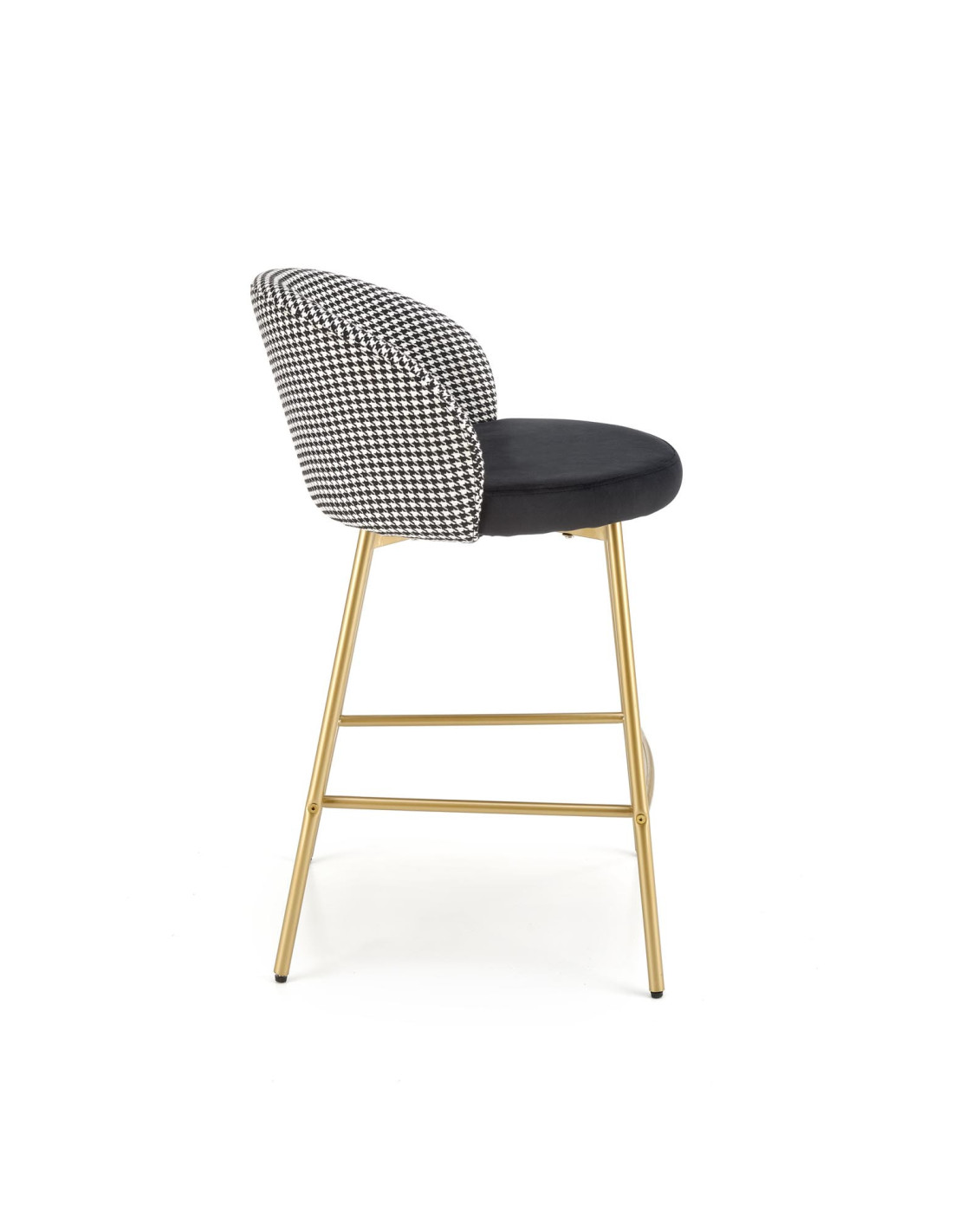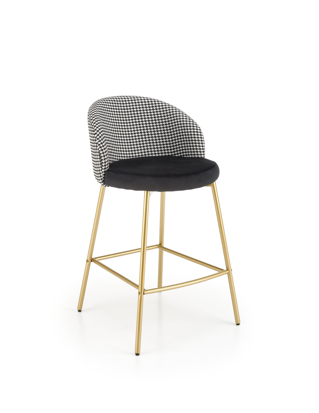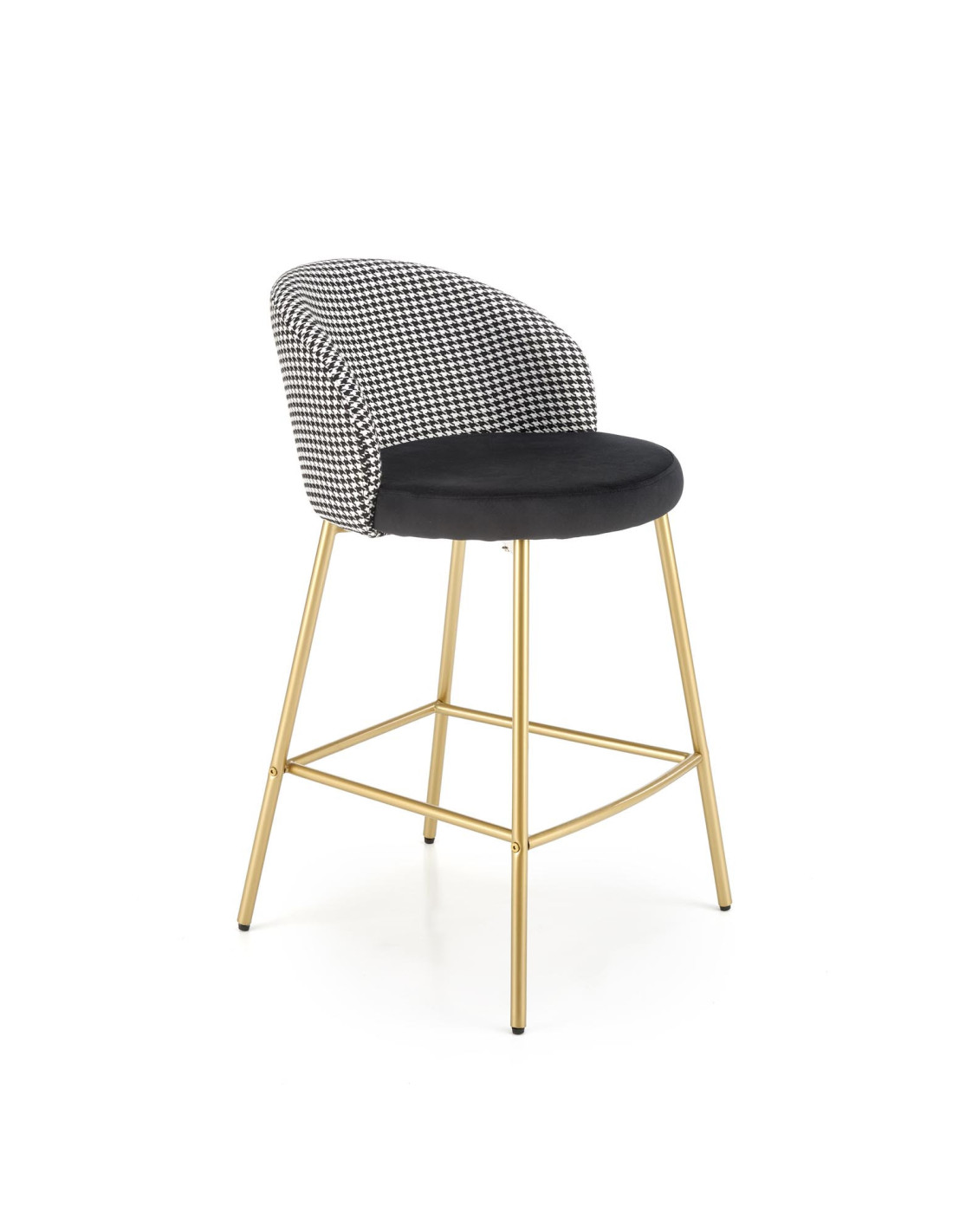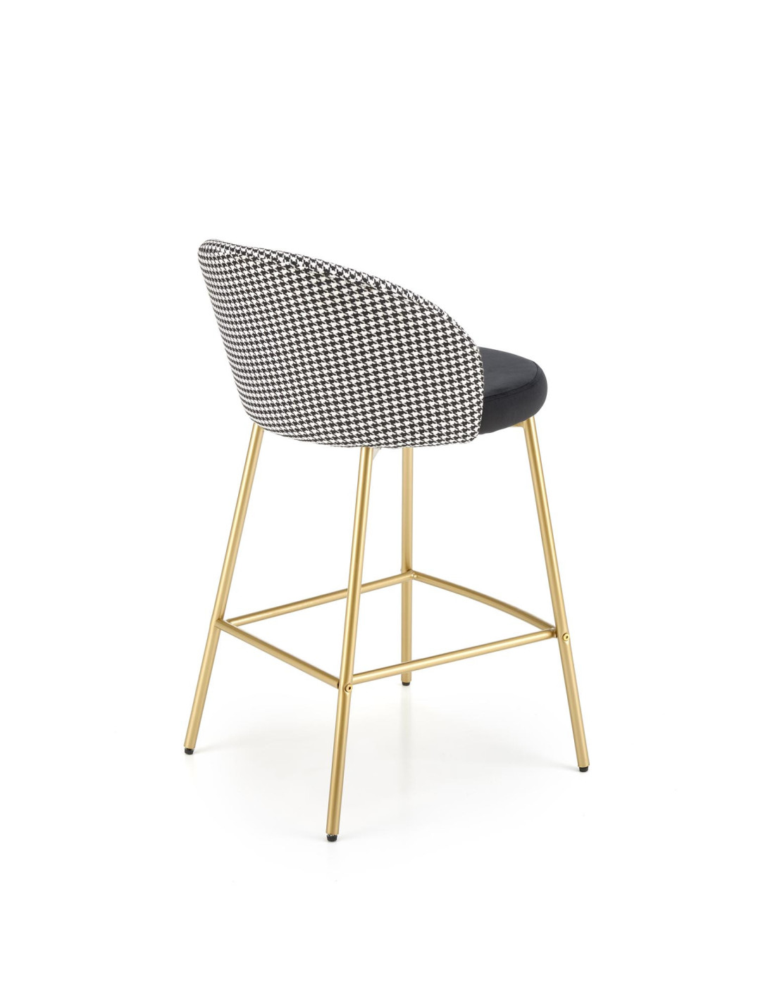 Nadaj styl swojemu wnętrzu z hokerem H113, który zachwyca nowoczesnym designem i eleganckim wykończeniem. Siedzisko tapicerowane jest miękkim materiałem w kolorze czarnym, co zapewnia wygodę podczas siedzenia. Oparcie z czarno-białym wzorem pepitki dodaje mu charakteru, a złote metalowe nogi stanowią nie tylko estetyczny akcent, ale także gwarantują stabilność.