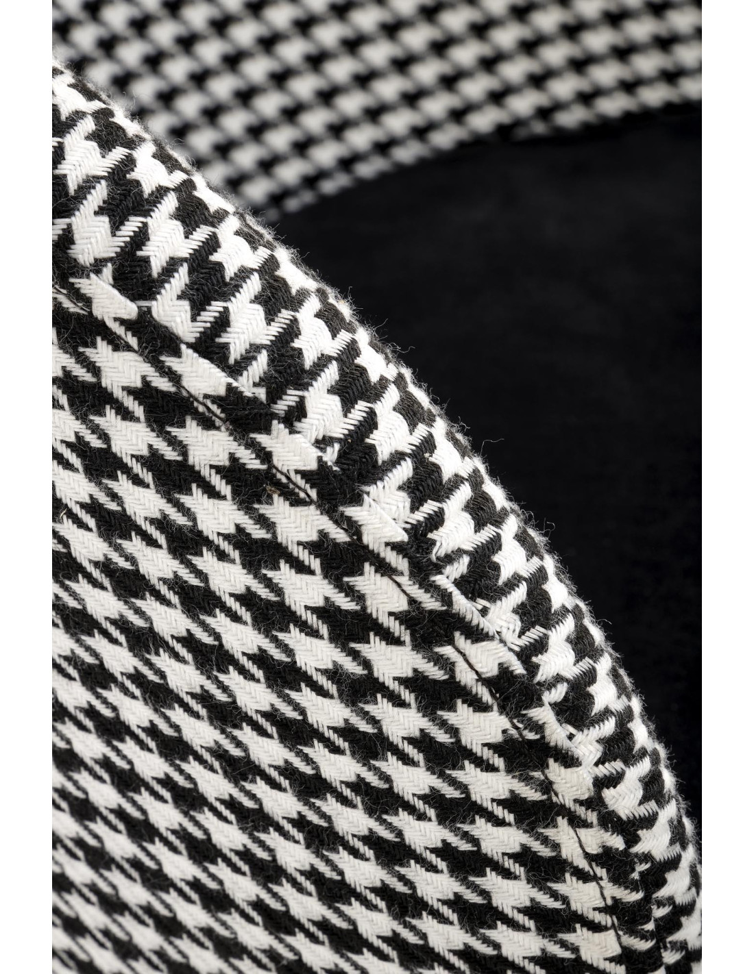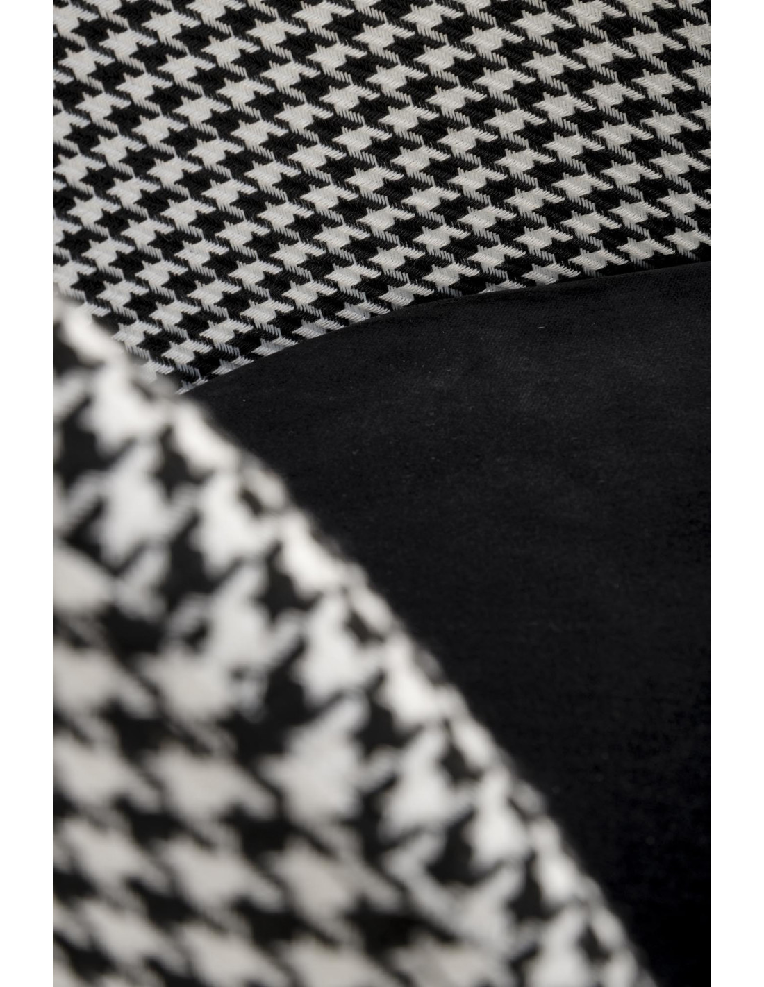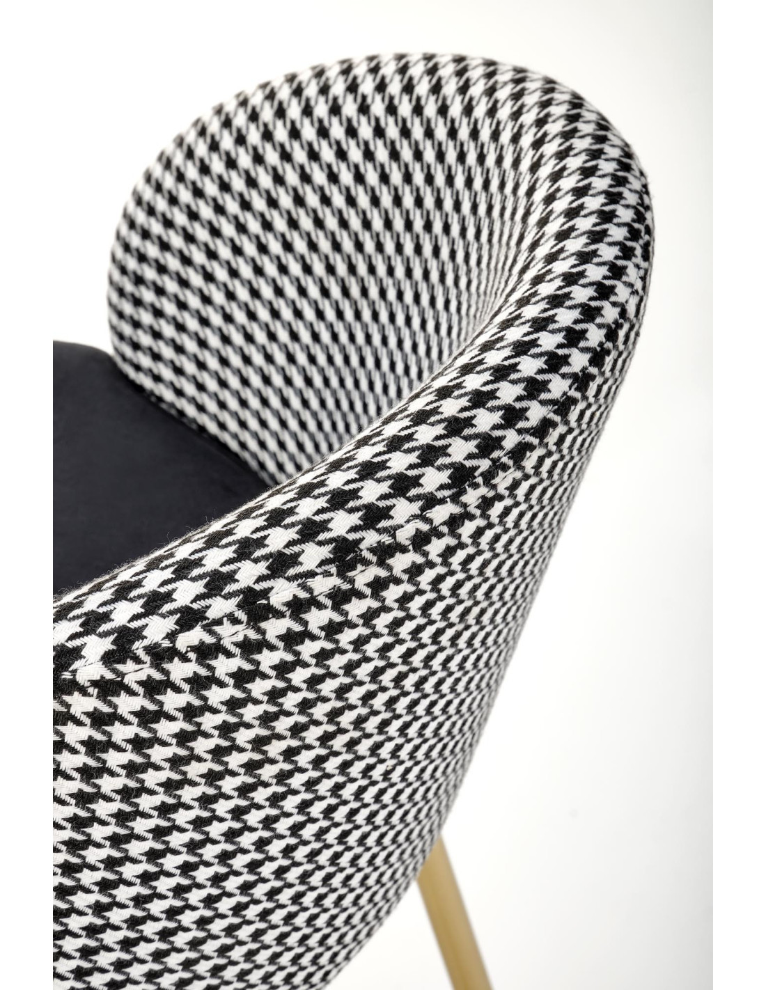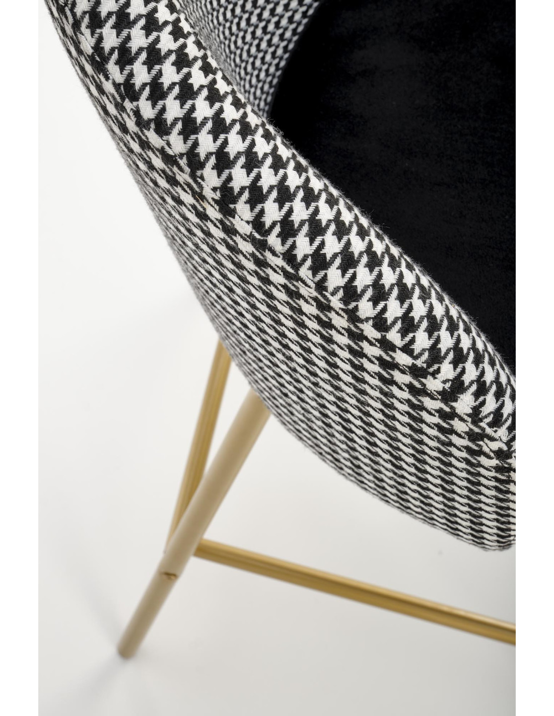 Nadaj styl swojemu wnętrzu z hokerem H113, który zachwyca nowoczesnym designem i eleganckim wykończeniem. Siedzisko tapicerowane jest miękkim materiałem w kolorze czarnym, co zapewnia wygodę podczas siedzenia. Oparcie z czarno-białym wzorem pepitki dodaje mu charakteru, a złote metalowe nogi stanowią nie tylko estetyczny akcent, ale także gwarantują stabilność.