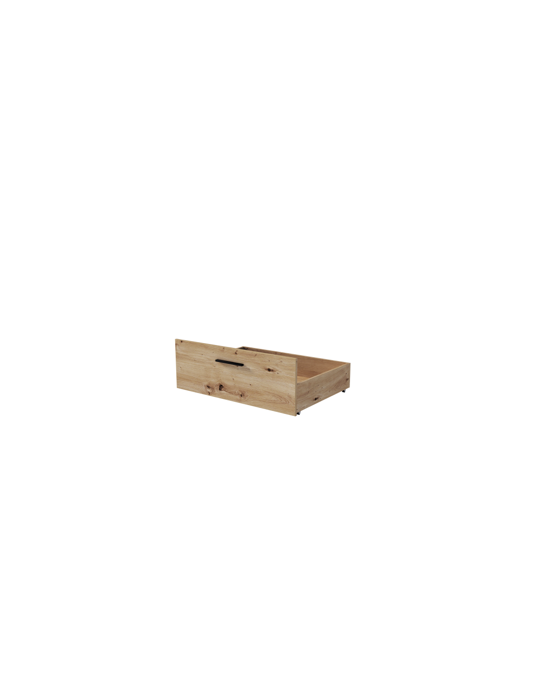 Szuflada VERSO wyróżnia się naturalnym wyglądem, czarnymi uchwytami oraz czterema kółkami, co ułatwia jej przesuwanie.