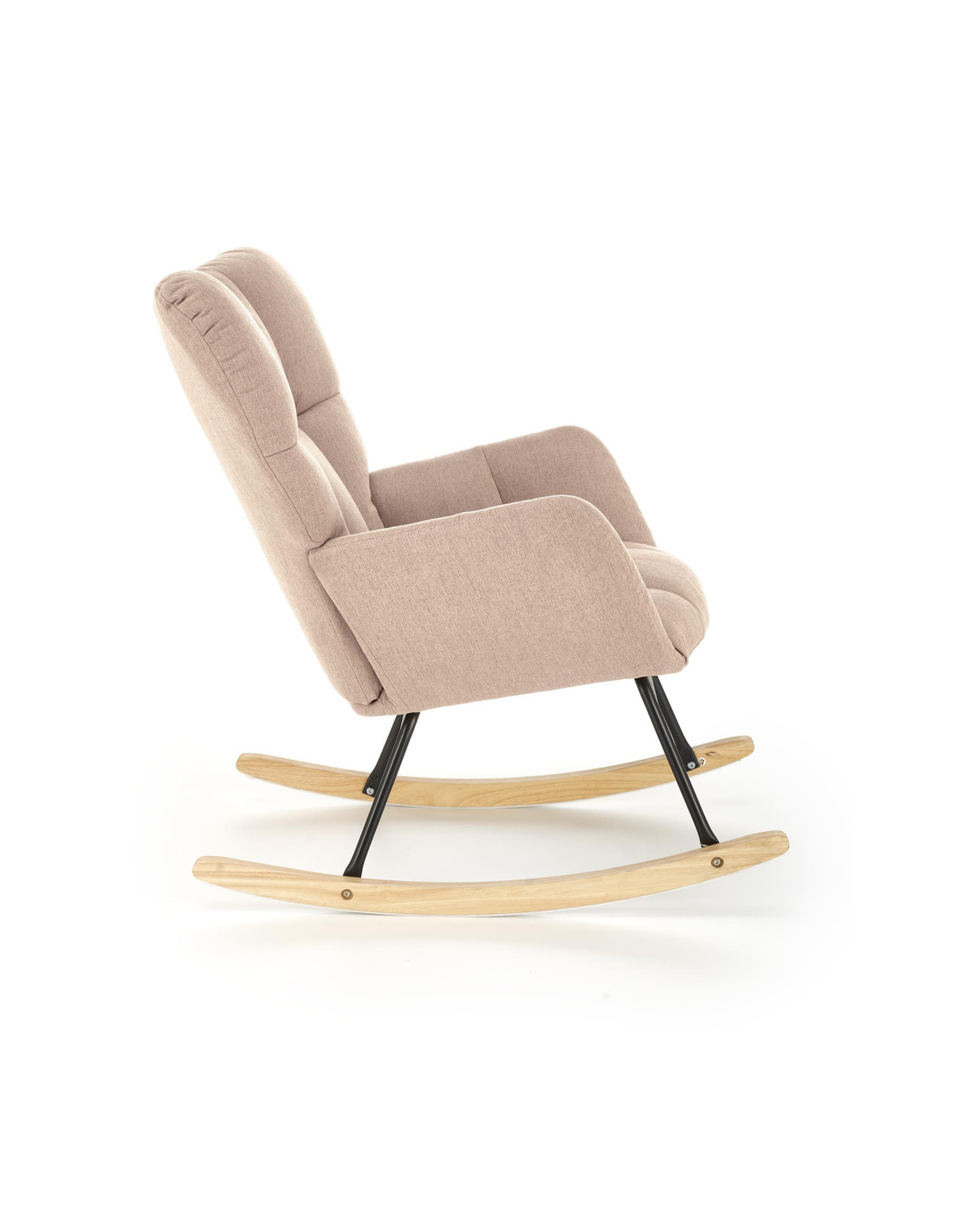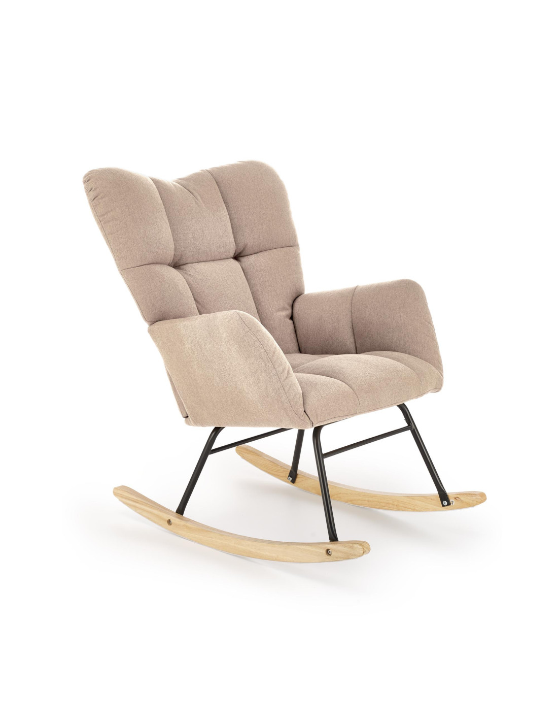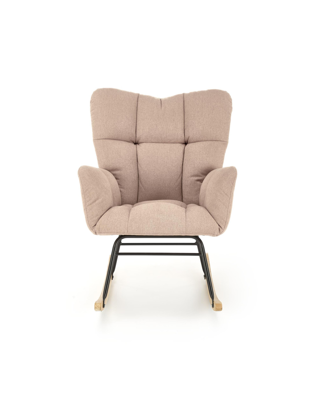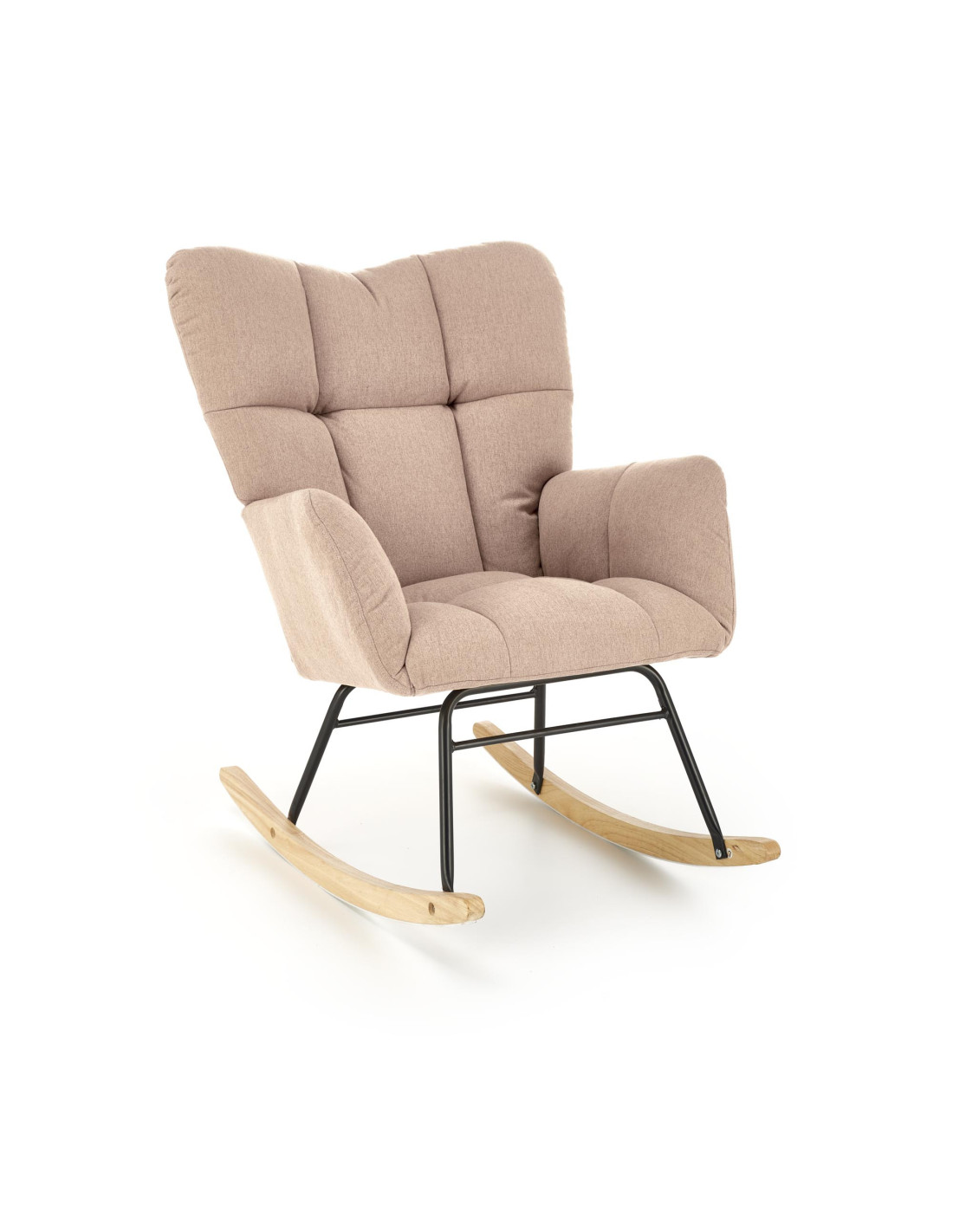 Dodaj odrobinę luksusu do swojego wnętrza z fotelem bujanym VASCO, który łączy elegancki design z niezrównanym komfortem. Pikowana tapicerka z miękkiego materiału sprawia, że każdy relaksujący moment w tym fotelu staje się wyjątkowy. Wysokie oparcie oraz wygodne podłokietniki zapewniają wsparcie, a drewniane płozy w naturalnym kolorze dodają mu uroku, harmonizując z czarną metalową ramą.