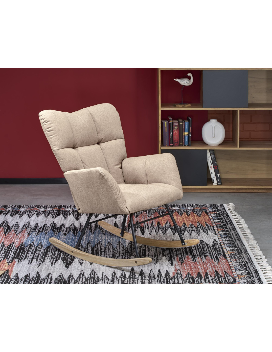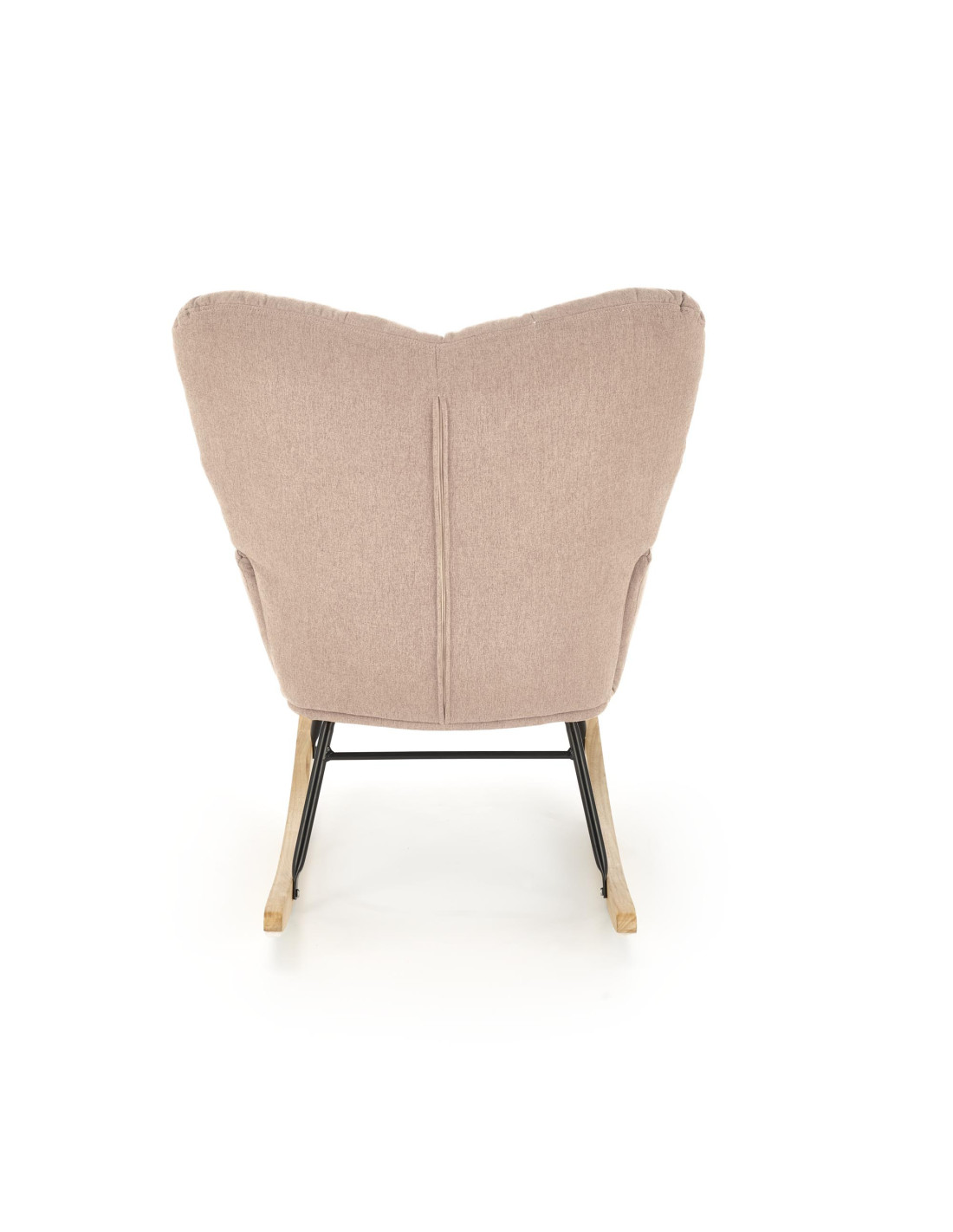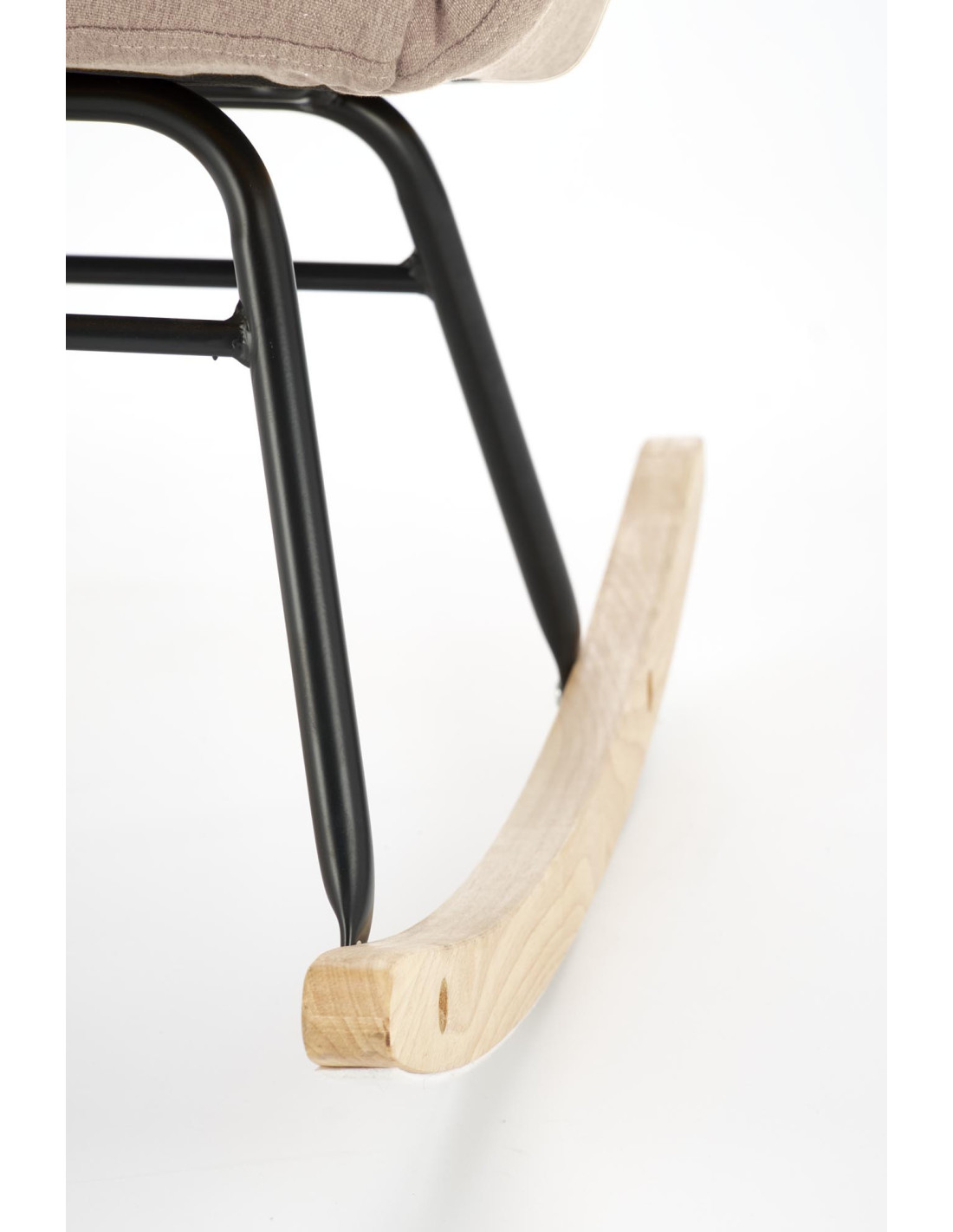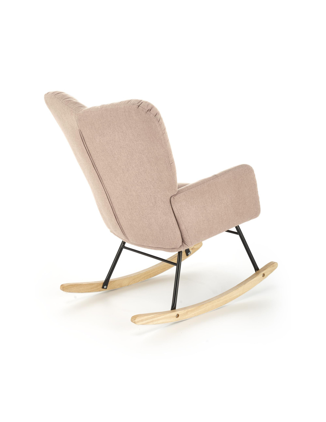 Dodaj odrobinę luksusu do swojego wnętrza z fotelem bujanym VASCO, który łączy elegancki design z niezrównanym komfortem. Pikowana tapicerka z miękkiego materiału sprawia, że każdy relaksujący moment w tym fotelu staje się wyjątkowy. Wysokie oparcie oraz wygodne podłokietniki zapewniają wsparcie, a drewniane płozy w naturalnym kolorze dodają mu uroku, harmonizując z czarną metalową ramą.