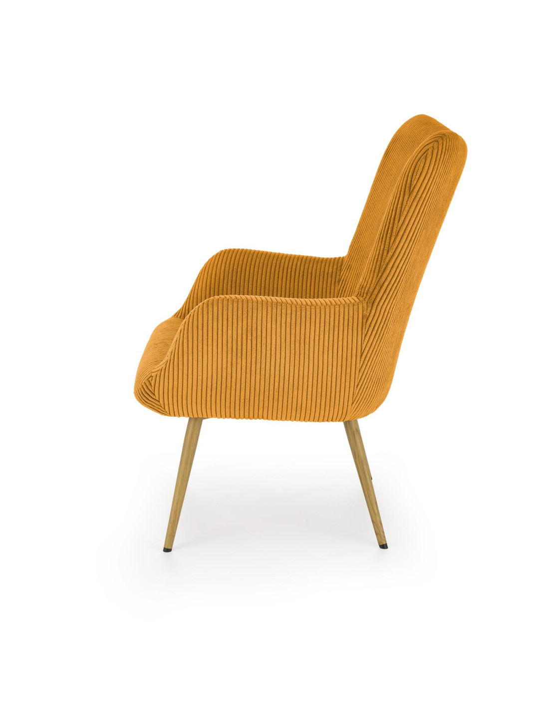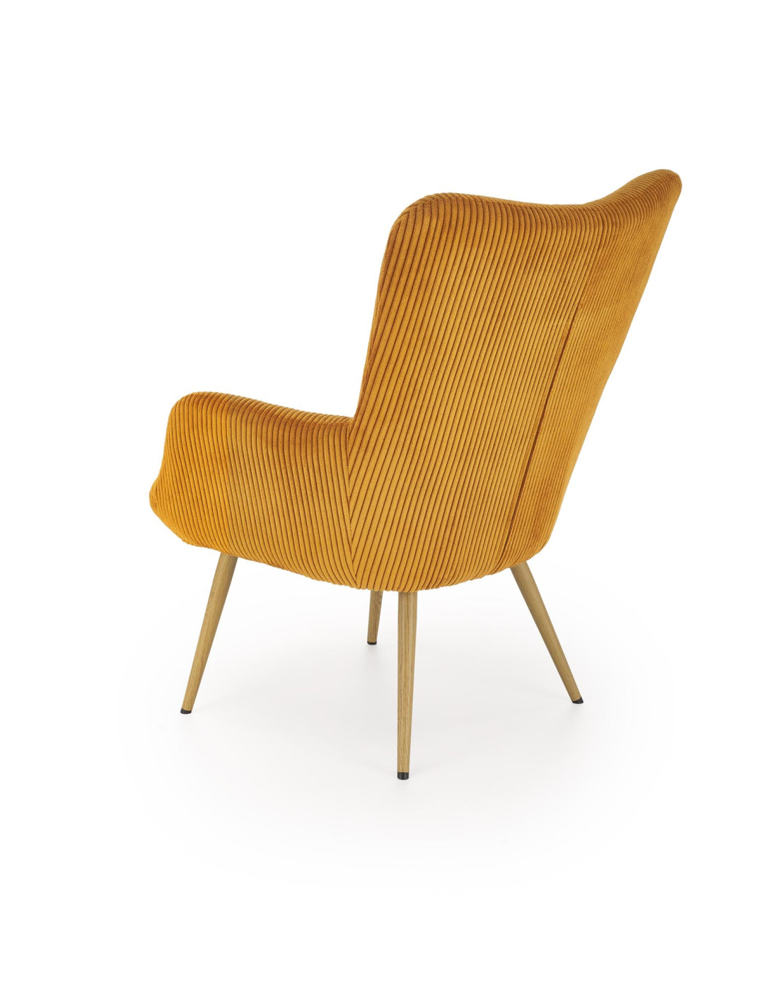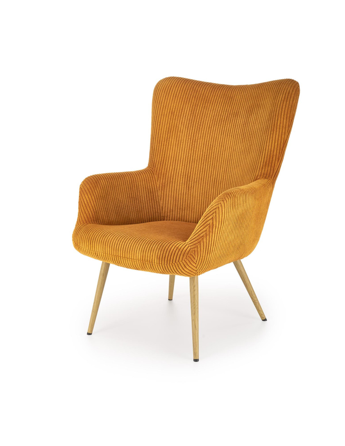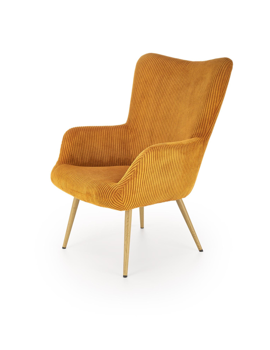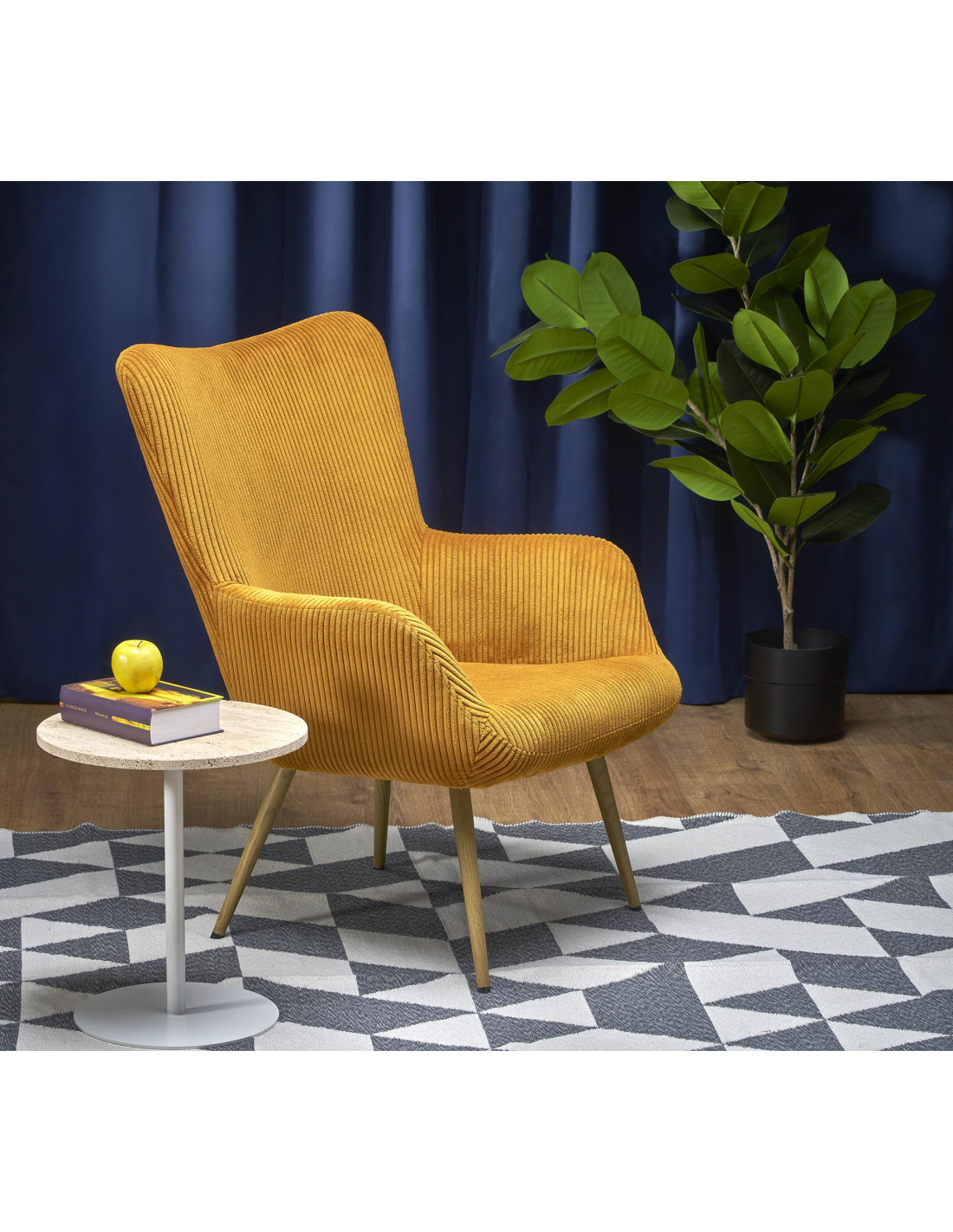 Dodaj piękny akcent do swojego wnętrza z fotelem wypoczynkowym AMARO! Jego musztardowy kolor oraz sztruksowy materiał wprowadzają do przestrzeni elegancję i odrobinę retro stylu. Zaokrąglone boki i oparcie dopełniają harmonijny wygląd, a smukłe, drewniane nogi ustawione pod kątem zapewniają nie tylko estetykę, ale również stabilność. Każdy moment spędzony na tym fotelu to prawdziwa przyjemność.