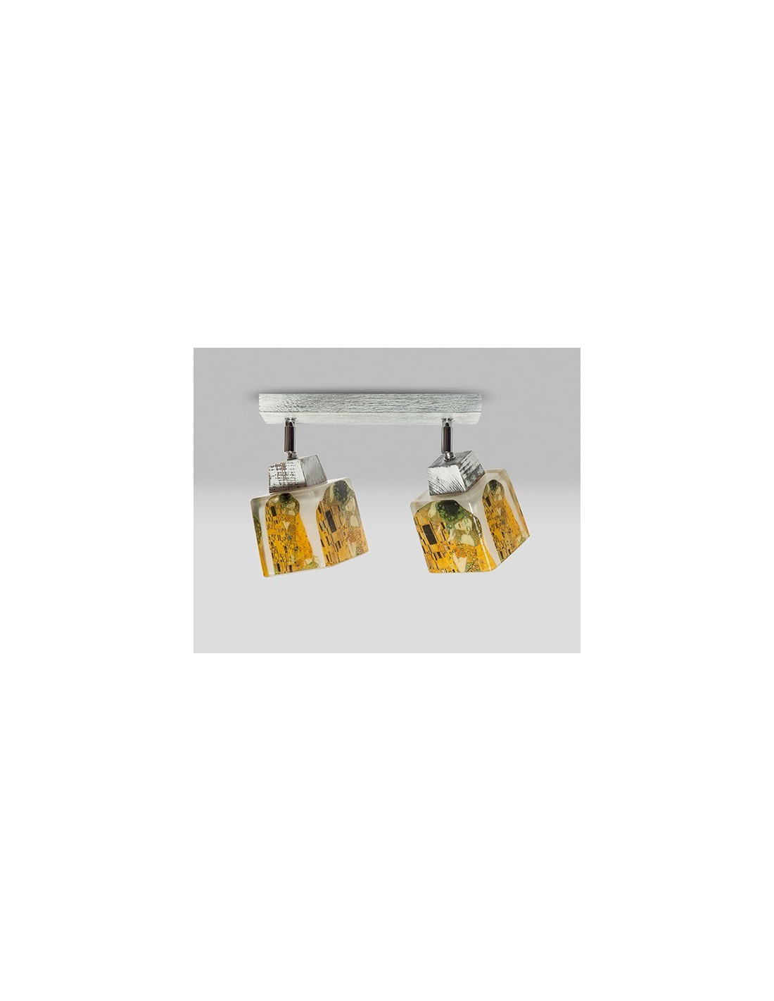 Plafon prowansalski z możliwością regulacji kąta świecenia dzięki zastosowaniu przegubów. Klosze zostały ręcznie udekorowane motywem z obrazu "Pocałunek" Gustava Klimta. Wykończenie lampy stanowi drewno bukowe, które po pomalowaniu na biało zostało dodatkowo przetarte.