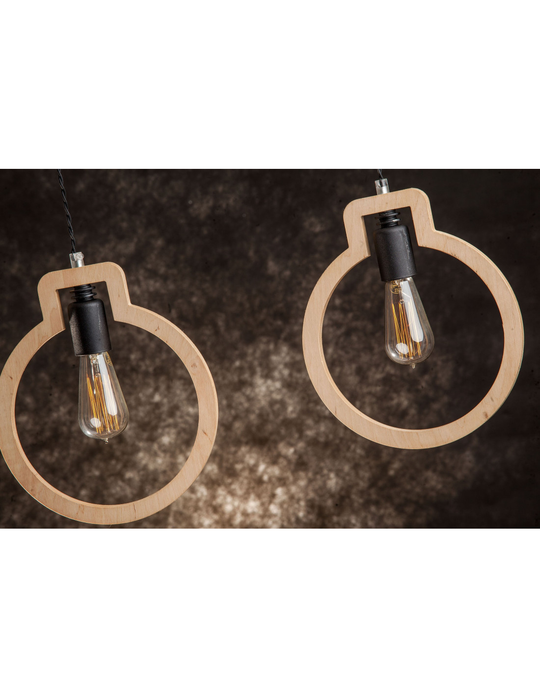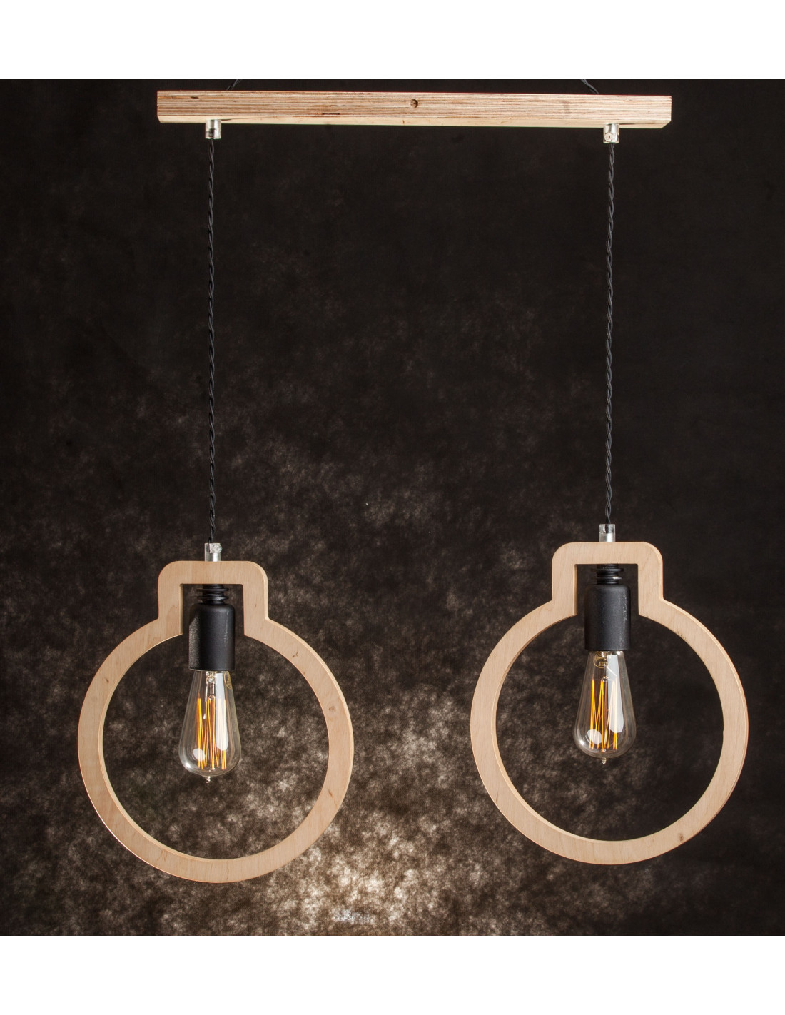 Lampa Light Bulb 2 kształtem przypominająca zarys dwóch żarówek, wykonana jest ze sklejki o grubości 1,7 cm, którą przetarliśmy woskiem naturalnym. Dopełnieniem jej są elementy metalowe wyglądające jakby były nie domalowane też w kolorze czarnym. Ekspresji dodaje też kabel podwójnie skręcony w czarnym bawełnianym oplocie. Lampa wyróżniająca się designem,dobrze się wpisuje w różne wnętrza.