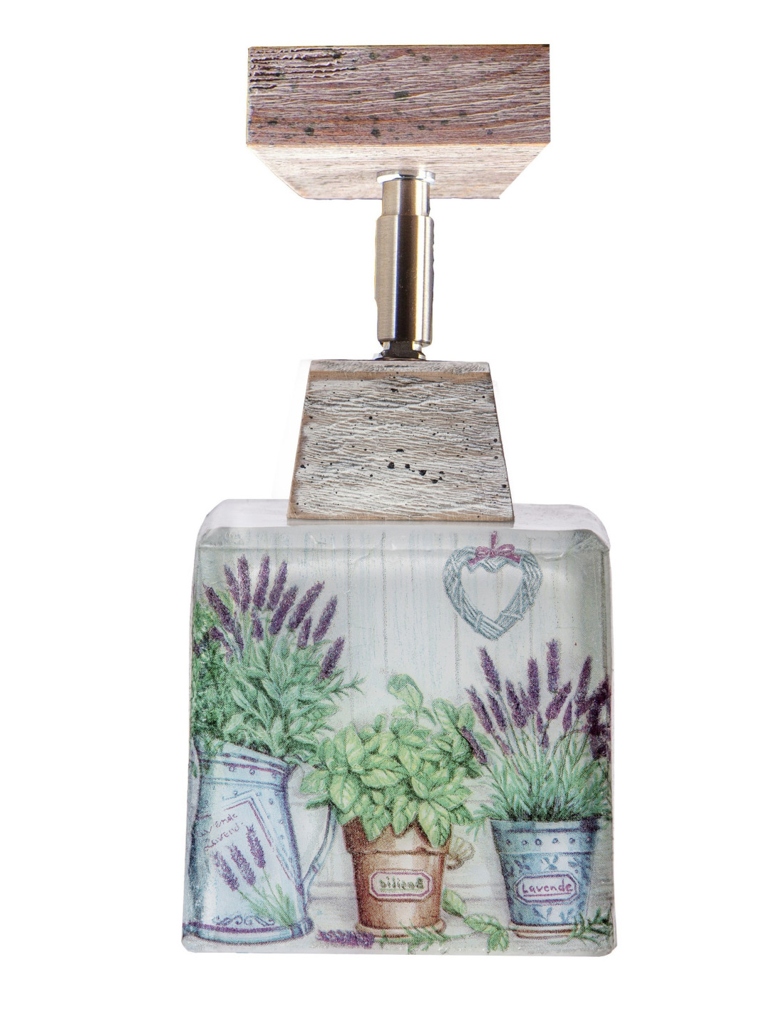 Przepiękny plafon prowansalski. Grube szkło matowane od wewnątrz, na którym ręcznie namalowano motyw lawendy. Drewno bukowe, które po pomalowaniu zostało przetarte, aby uwidocznić swoje piękno. Plafon stworzy wyjątkową atmosferę razem z innymi naszymi lampami prowansalskimi z rodziny Scandia. Sprawdź również inne nasze plafony prowansalskie.