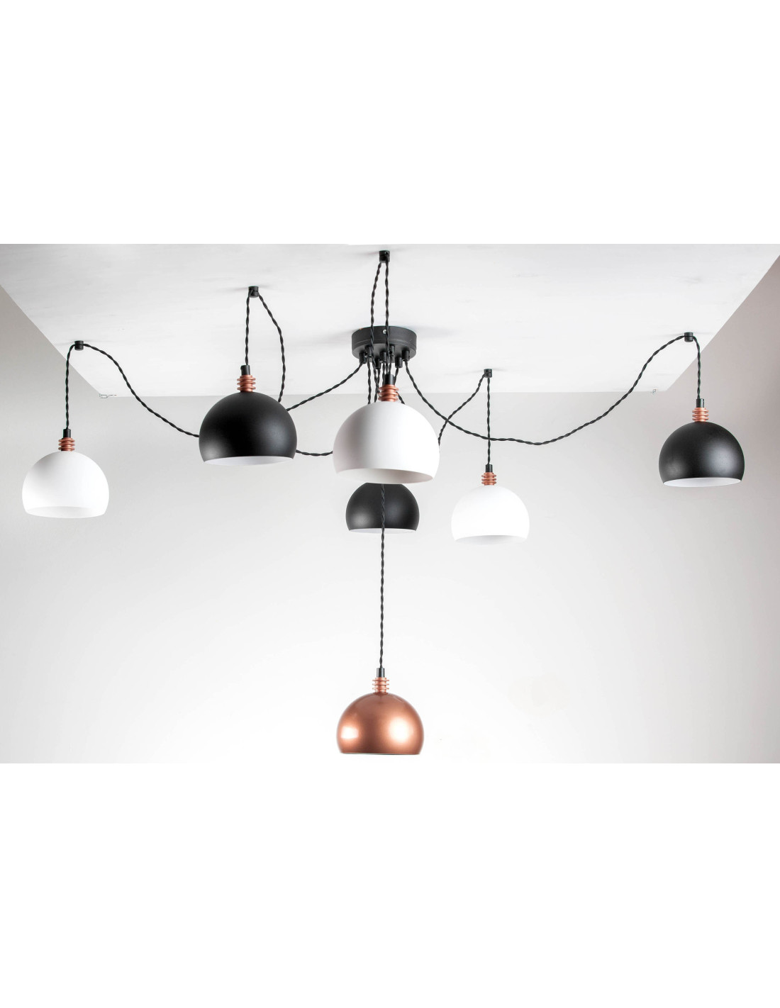 Lampa pająk TESTER 7LP-elegancka,stylowa lampa stanowi ciekawy pomysł na designerskie oświetlenie wnętrza.W lampie wszystko jest regulowane i zależy od naszej wizji.Lampa ta zrywa z tradycyjnym podejściem do oświetlenia przestrzeni mieszkalnych.W tej lampie nic nie jest przypadkowe.Ekspresji dodają kolory kul jak i też kabel podwójnie skręcony w czarnym bawełnianym oplocie.