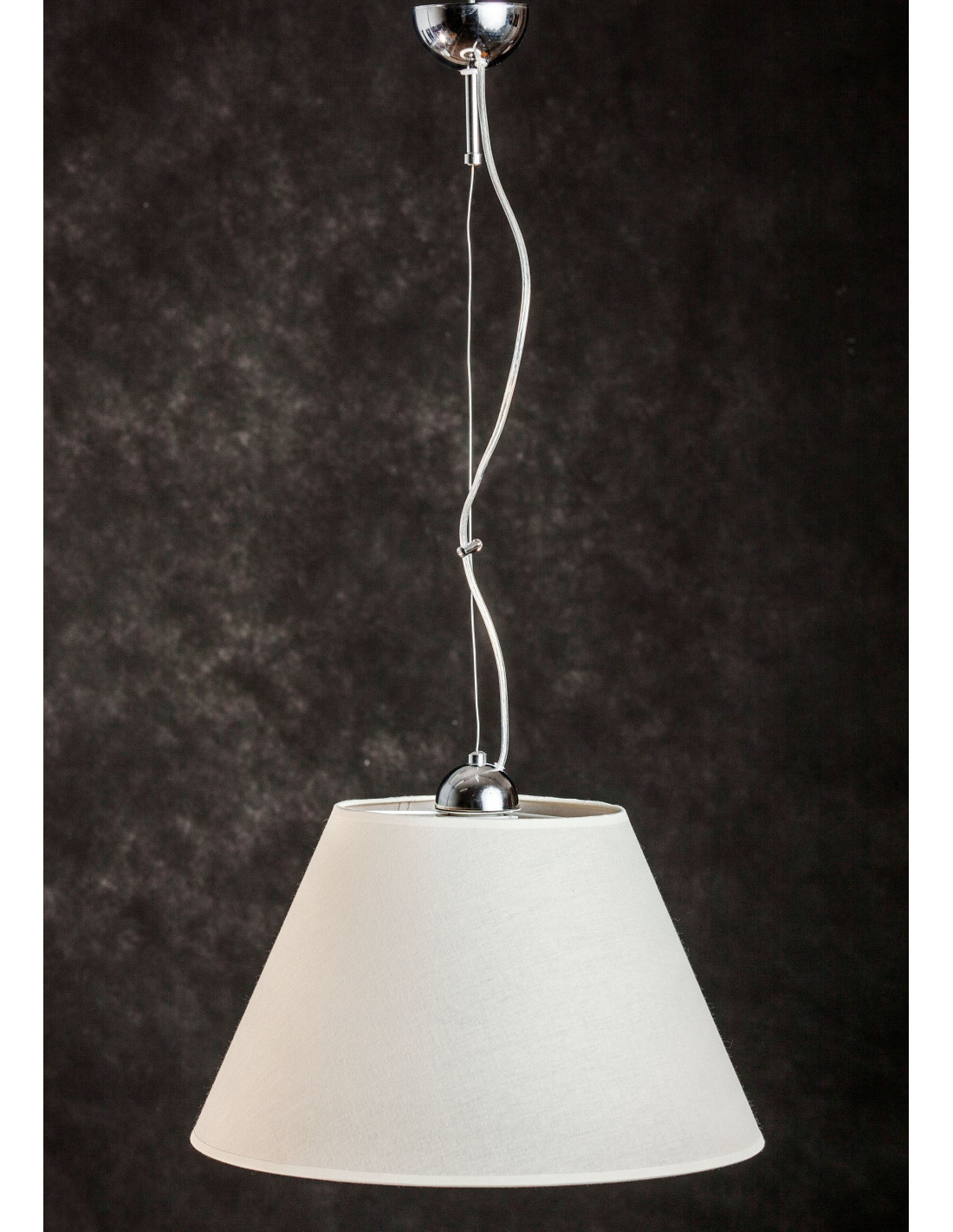 Elegancka lampa nawiązująca do klasycznego, najbardziej eleganckiego designu oświetlenia. Abażur z tkaniny w kolorze ecru,ręcznie szyty, zawieszony na lince stalowej. Kolor chrom. Polecamy do salonu, sypialni lub jadalni w stylu nowoczesnym.