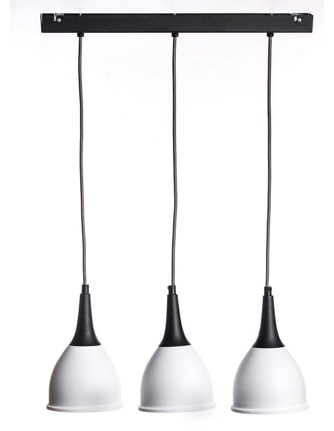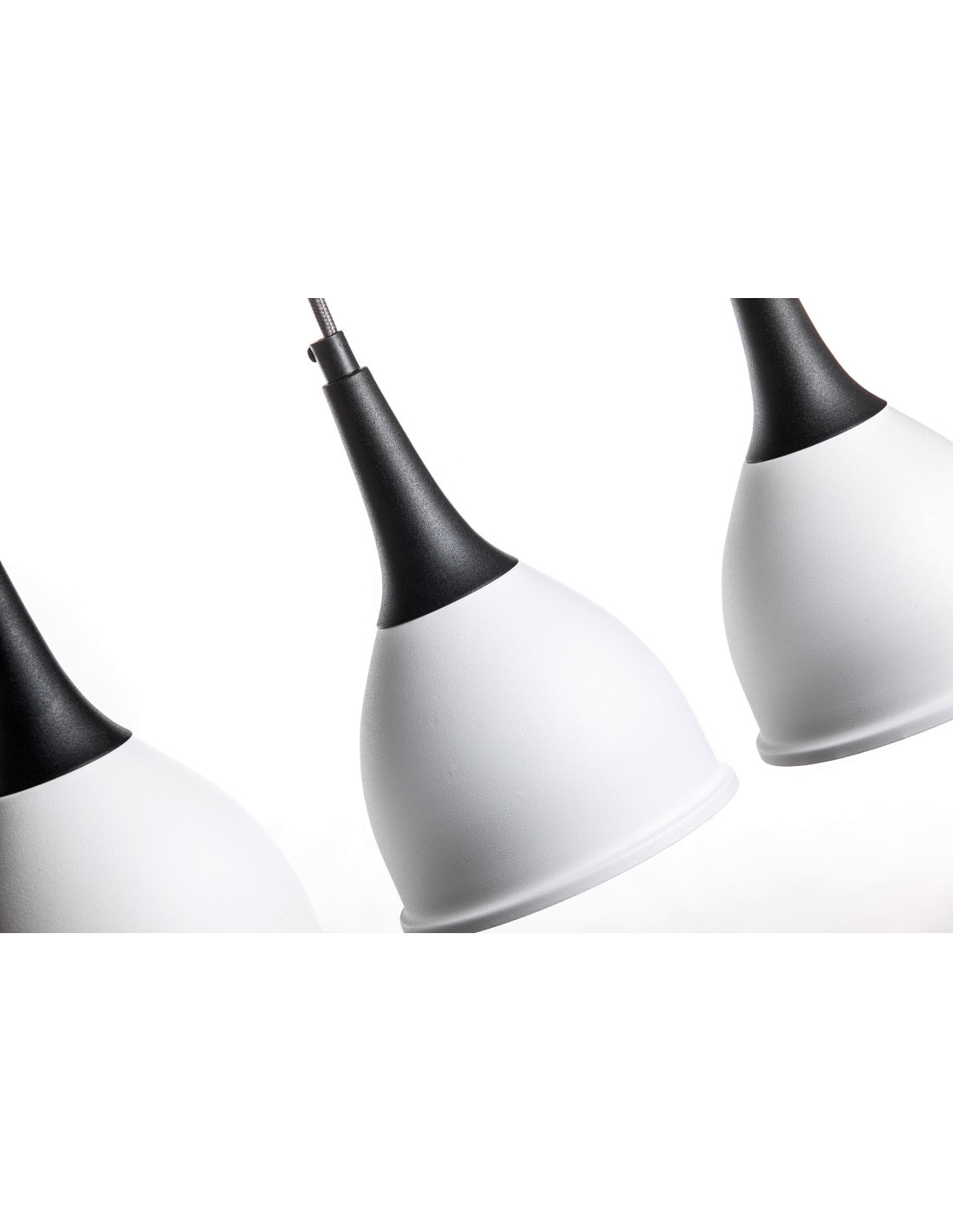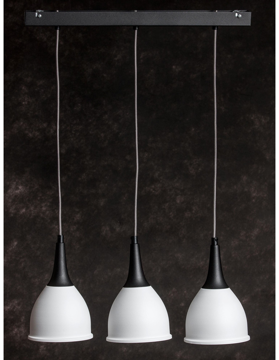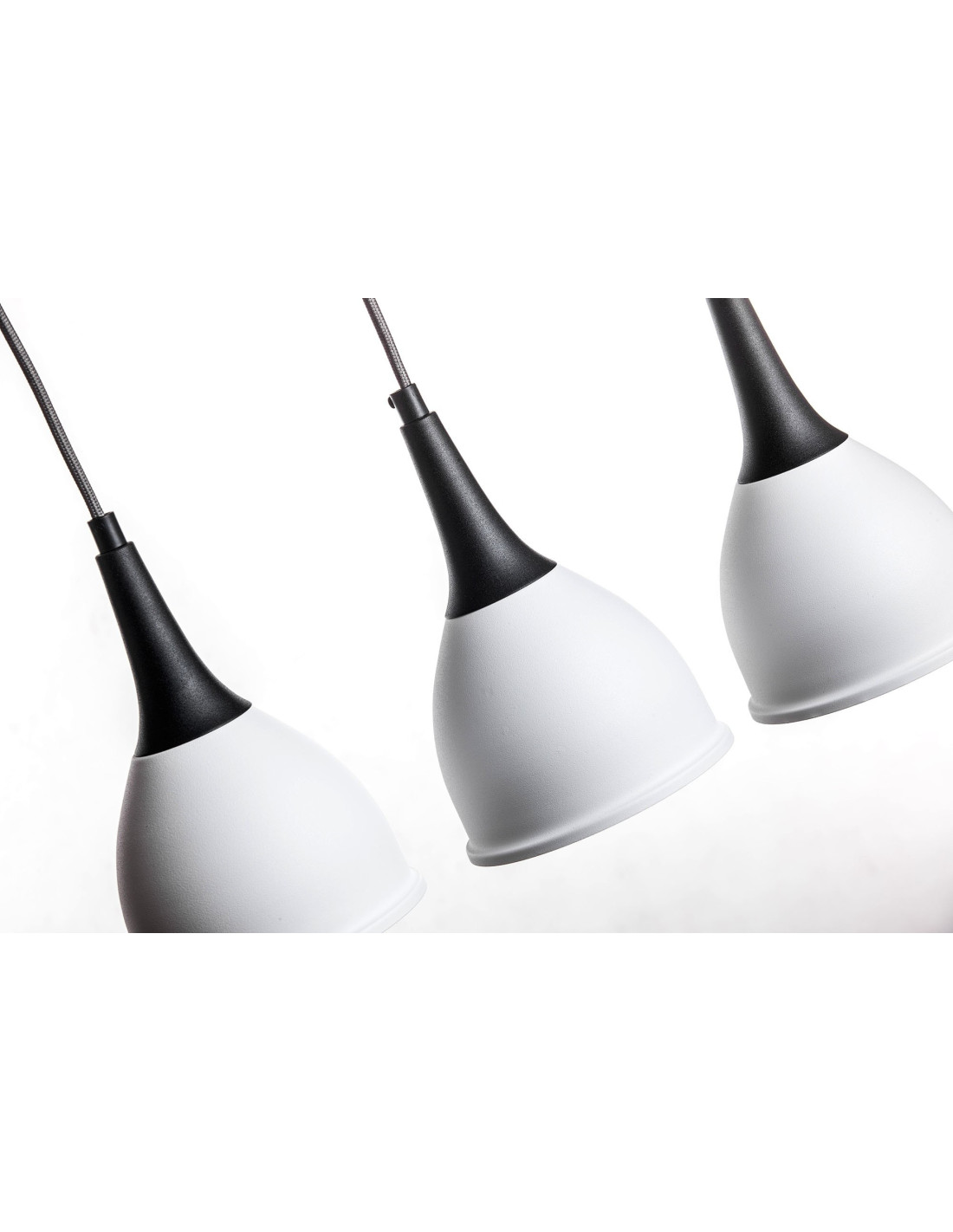 Lampa Monic 3-pkt.w kolorze czarno białym charakteryzuje się niezwykle nowoczesnym kształtem klosza wykonanego z metalu, swoim kształtem przypominającego krople wody.Lampa jest nowoczesna i niepowtarzalna. Dopełnieniem designu lampy jest kabel w bawełnianym szarym oplocie. Lampa ta stanowić będzie idealne uzupełnienie nowoczesnych aranżacji.