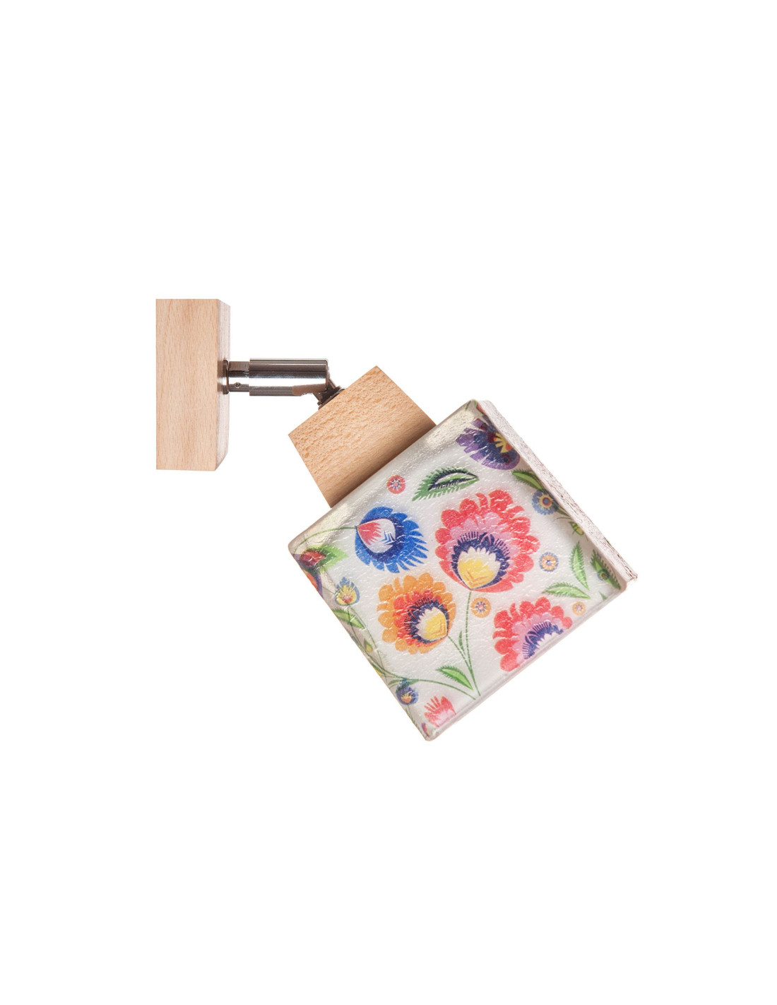 Kinkiet folkowy 1B wykonany z litego drewna bukowego,które zostało poddane procesowi woskowania.Do produkcji jego użyliśmy szkła w kształcie kwadratu ,które ręcznie zostało ozdobione motywami w stylu folk.Klosze został zamontowany na przegubie i wyposażone w oprawkę E27 co powoduje ,że w epoce ledów może oświetlić ok 10 m2.Unikalny design lampy powoduje ,że nie przejdziemy obok niej obojętnie.