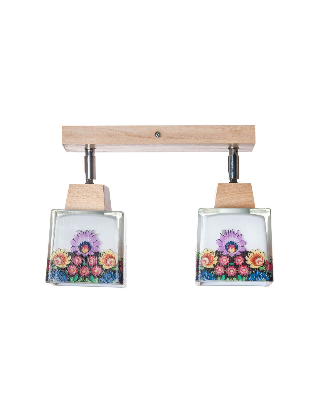 Plafon folkowy 2A wykonany z litego drewna bukowego,które zostało poddane procesowi woskowania.Do produkcji jego użyliśmy szkła w kształcie kwadratu ,które ręcznie zostało ozdobione motywami w stylu folk.Klosze zostały zamontowane na przegubach i wyposażone w oprawkę E27 co powoduje ,że w epoce ledów może oświetlić ok 16 m2.Unikalny design lampy powoduje ,że nie przejdziemy obok niej obojętnie.