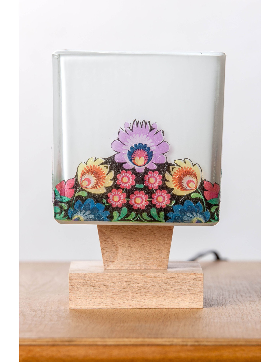 Lampka Folkowa 1A wykonana jest z litego drewna bukowego-woskowanego i szkła włoskiego ręcznie dekorowanego.Lampka ma ciekawy folk design,na pewno ożywi Twoje wnętrze i nada mu niepowtarzalny charakter z ludowym akcentem. Folk lampka nocna stworzy przytulną atmosferę rozpraszając światło na całej powierzchni klosza, podkreślając jednocześnie urok ludowego wzoru.