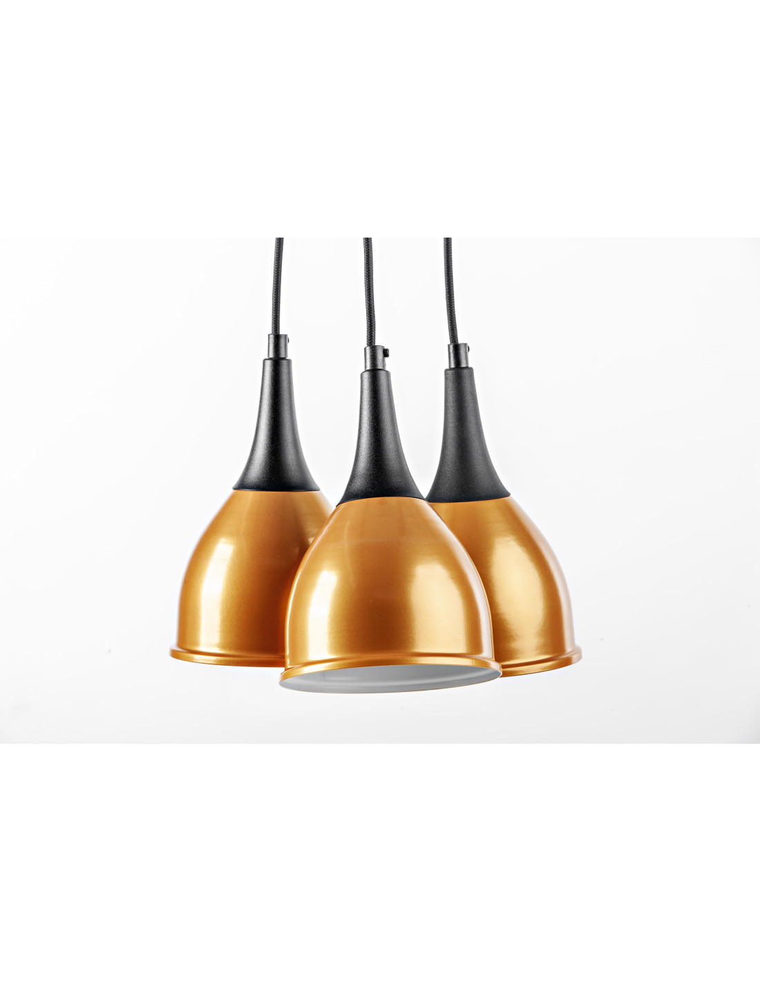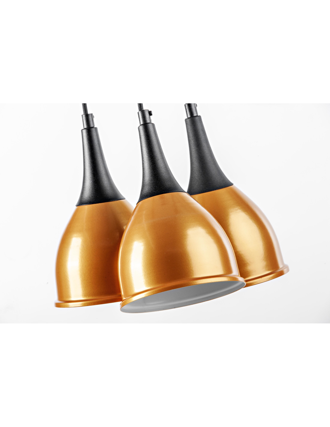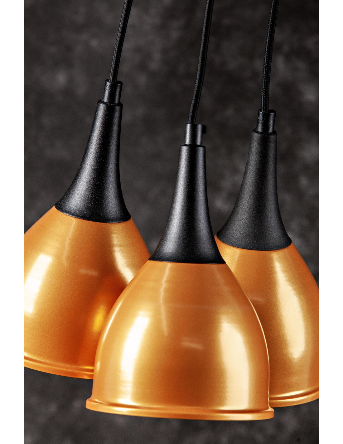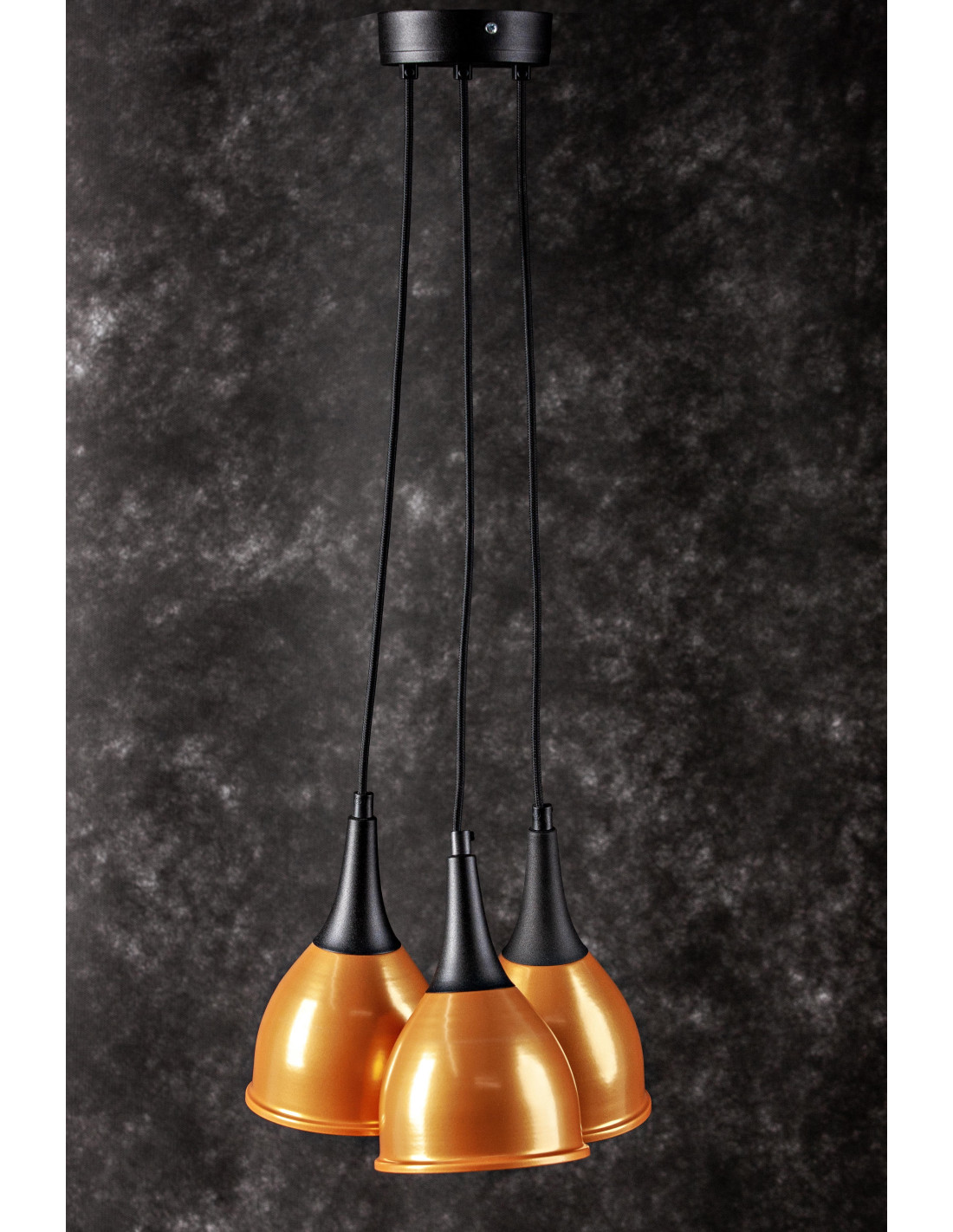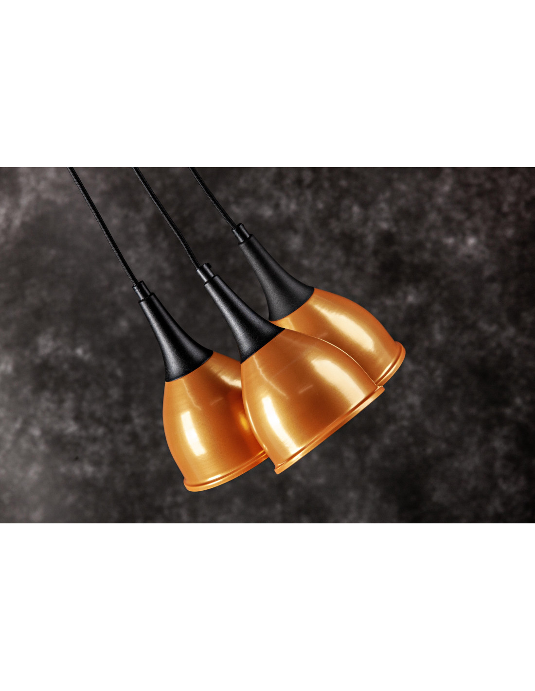 Lampa Monic 3-pkt. w kolorze złoto-czarnym,charakteryzuje się niezwykle nowoczesnym kształtem klosza wykonanego z metalu, swoim kształtem przypominającego krople wody.Lampa jest nowoczesna i niepowtarzalna. Dopełnieniem designu lampy jest kabel w bawełnianym czarnym oplocie. Lampa ta stanowić będzie idealne uzupełnienie nowoczesnych aranżacji.
