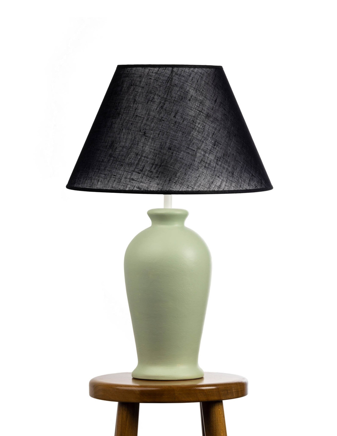 Lampa Ceramiczna ERIS w kolorze mięty z abażurem z tkaniny w kolorze czarnym, ręcznie przeszytym i podklejonym PCV, wykończonym lamówką w tym samym kolorze. Idealna zarówno do nowoczesnych i klasycznych wnętrz ,lampa też świetnie wpisze się w nurt pomieszczeń w stylu prowansalskim. Nasze lampy stołowe są wykonane z najwyższej jakości glinki ceramicznej.