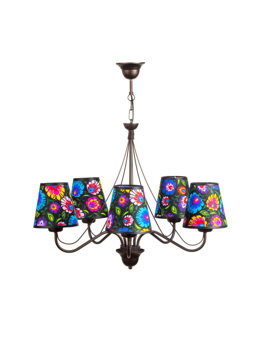 Żyrandol Katrin 5 to kwintesencja idealnej lampy.Połączenie koloru wenge(część metalowa) i abażurów z motywami folklorystycznymi rozmieszczonymi na czarnym tle,powodują ,że lampa ta będzie zawsze zauważona i na pewno nada pomieszczeniu ostrości i wyrazistości.Lampa jest ręcznie wykonana począwszy od części metalowej po abażury.