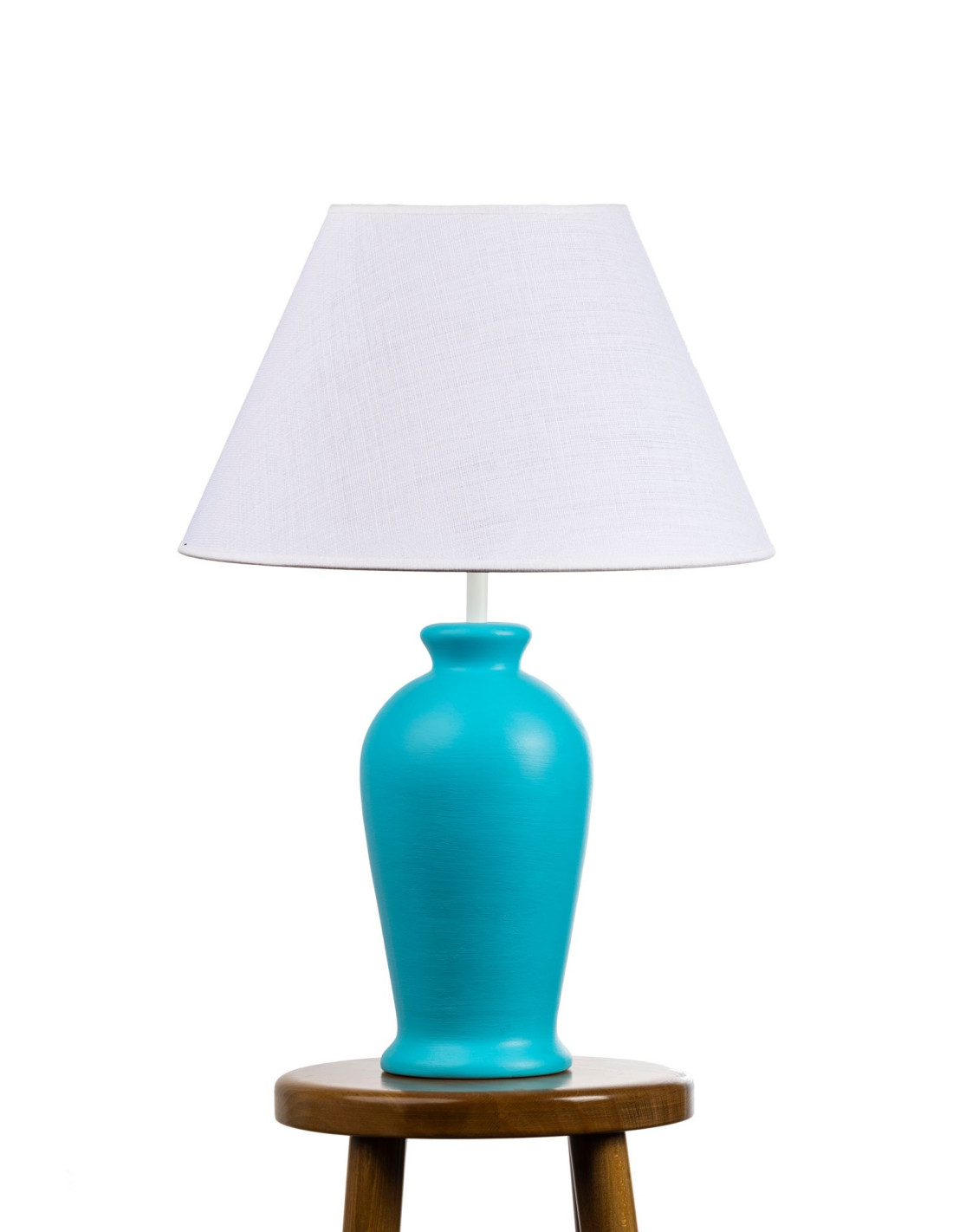 Lampa Ceramiczna ERIS w kolorze turkusu z abażurem z tkaniny w kolorze białym, ręcznie przeszytym i podklejonym PCV, wykończonym lamówką w tym samym kolorze. Idealna zarówno do nowoczesnych i klasycznych wnętrz ,lampa też świetnie wpisze się w nurt pomieszczeń w stylu prowansalskim. Nasze lampy stołowe są wykonane z najwyższej jakości glinki ceramicznej.