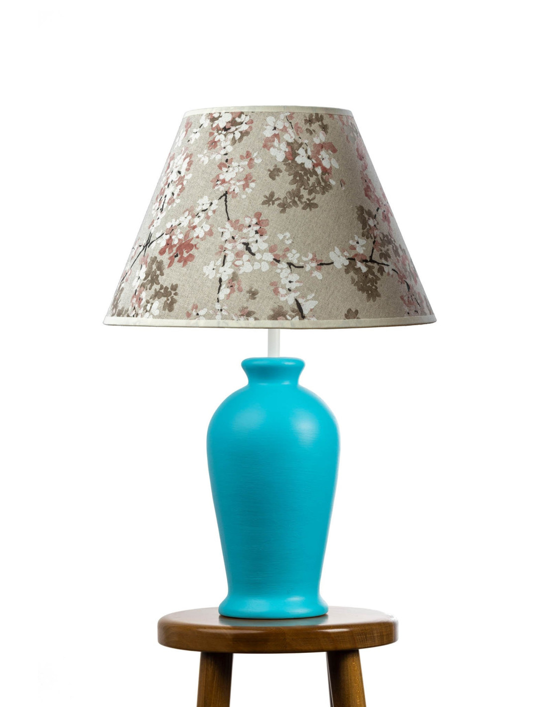 Lampa Ceramiczna ERIS w kolorze turkusu z abażurem z tkaniny, ręcznie przeszytym i podklejonym PCV z motywem kwiatów wiśni na gałązce, wykończonym lamówką w tym samym kolorze. Idealna zarówno do nowoczesnych i klasycznych wnętrz ,lampa też świetnie wpisze się w nurt pomieszczeń w stylu prowansalskim. Nasze lampy stołowe są wykonane z najwyższej jakości glinki ceramicznej.