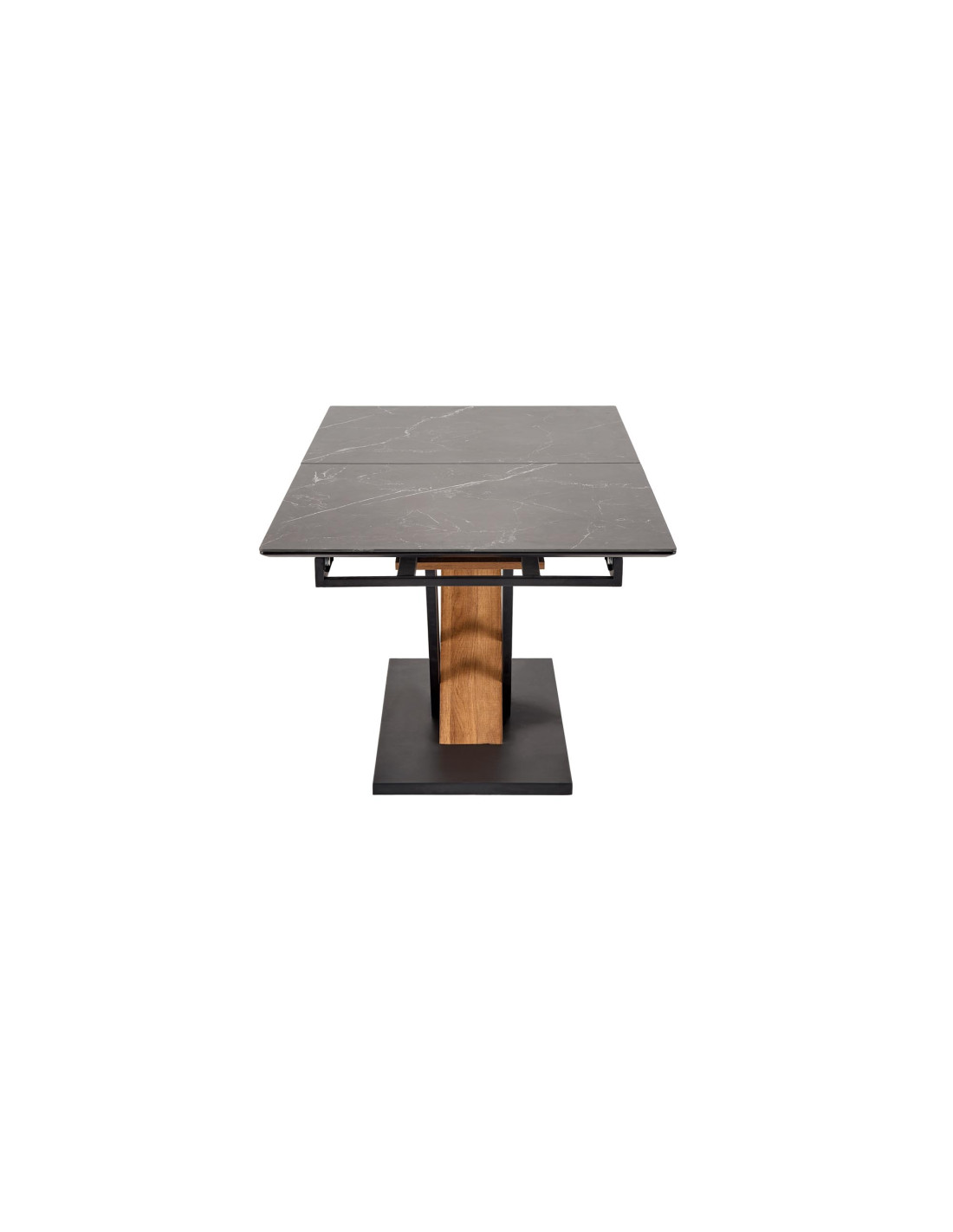 wymiary: 160-200/90/76 cm, stół rozkładany, materiał: spiek / MDF lakierowany / MDF okleinowany / stal malowana proszkowo, kolor: blat - czarny marmur, nogi - dąb złoty / czarny