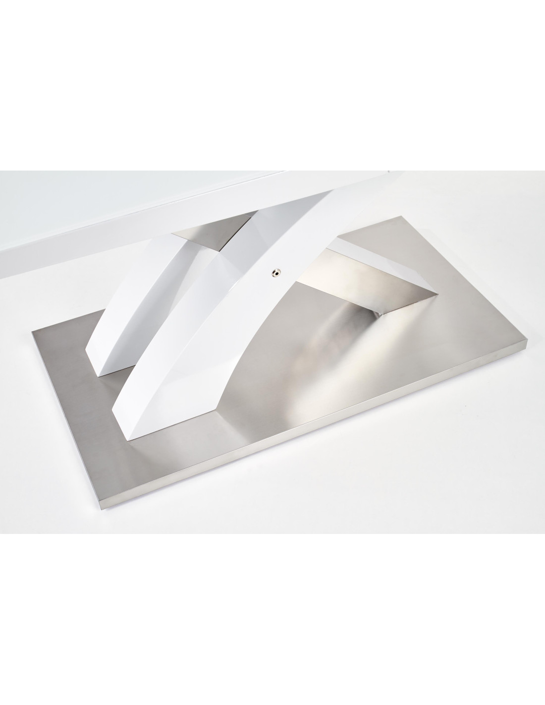 Blat stołu wykonano z wysokiej jakości płyty MDF w kolorze białym oraz szkła. Stabilna podstawa stołu jest wykonana ze stali nierdzewnej i płyty MDF co gwarantuje jego wysoką wytrzymałość.