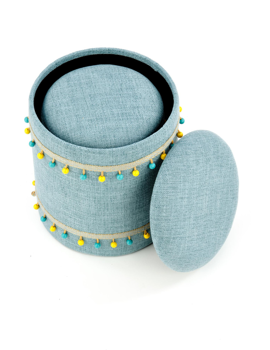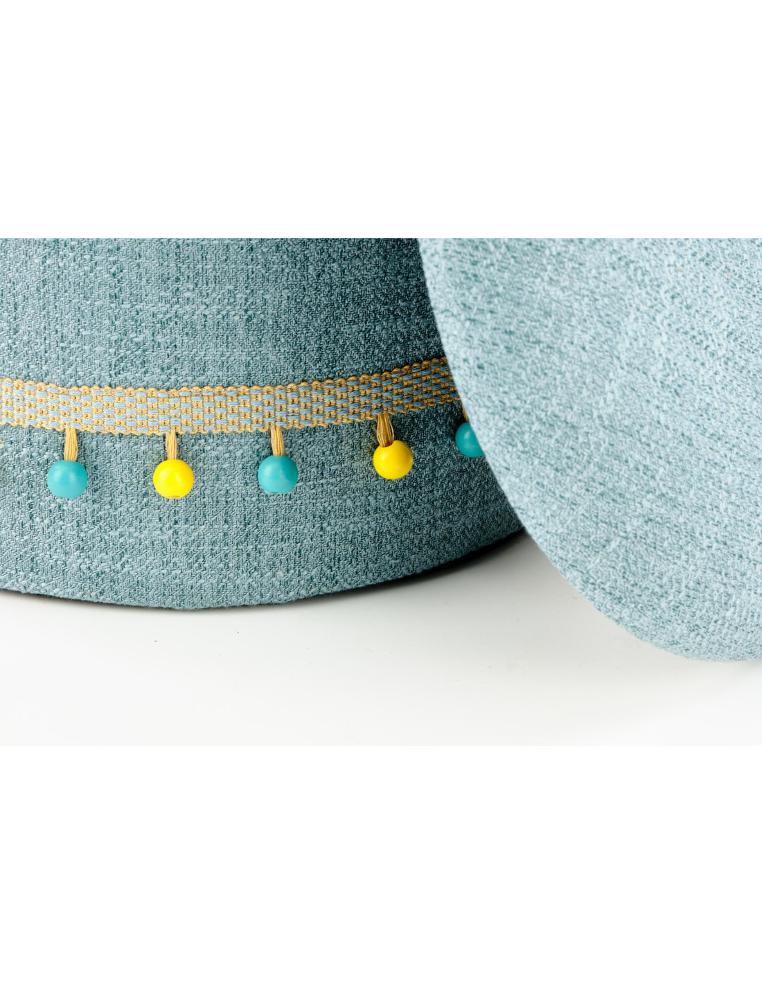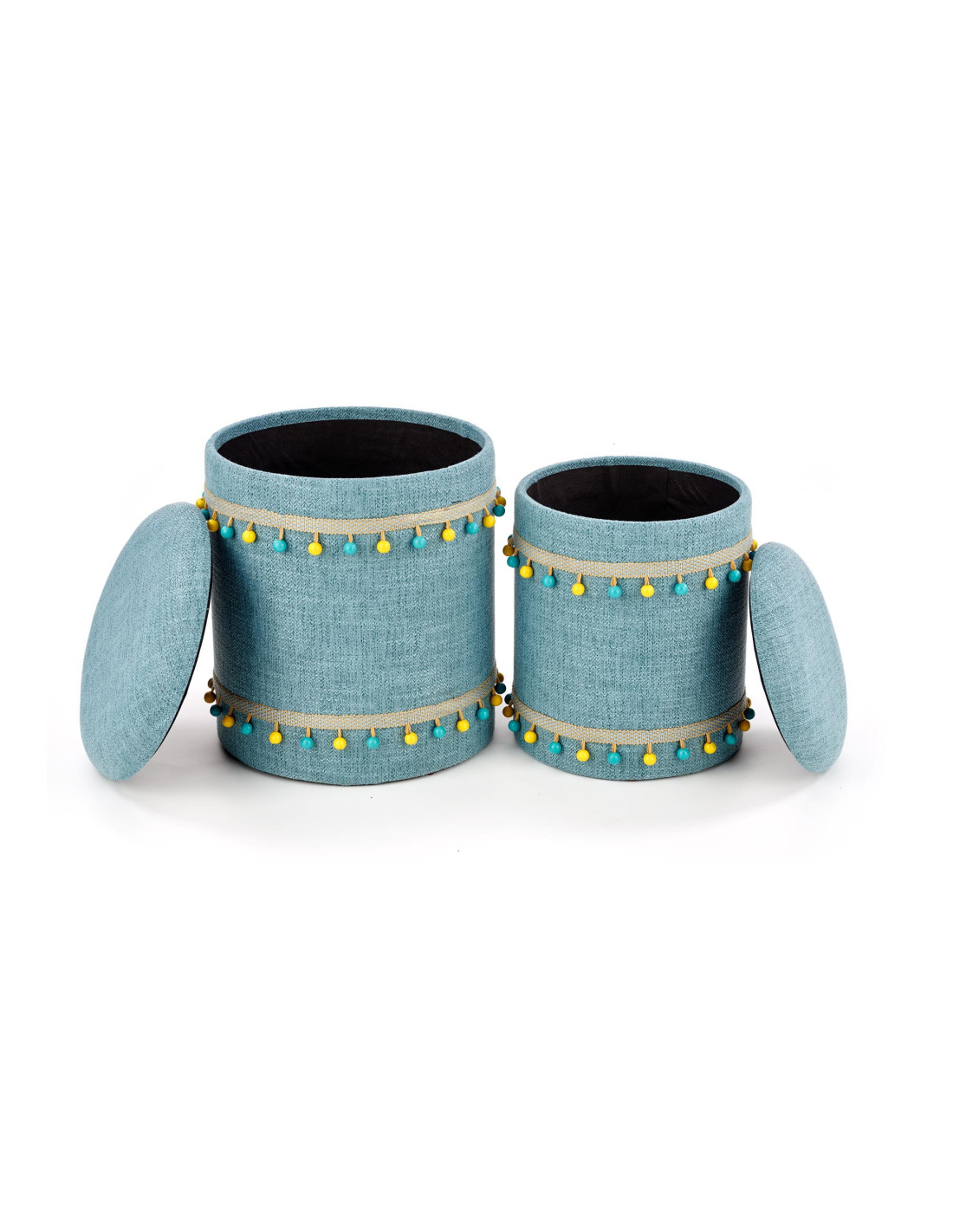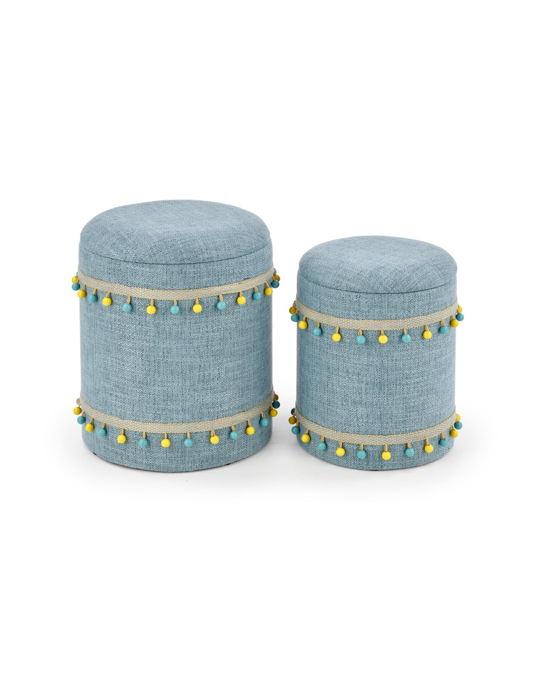 Stwórz doskonałe wnętrze z zestawem dwóch puf GRADO, które zachwycają swoim jasnoniebieskim kolorem oraz cylindrycznym kształtem. Te eleganckie pufy nie tylko dodają stylu, ale również oferują funkcję pojemnika, co czyni je praktycznym rozwiązaniem do każdego pomieszczenia. Ozdobne frędzle w kolorach żółtym i niebieskim sprawiają, że pufy stają się prawdziwą ozdobą wnętrza, idealnie wpisując się w boho styl, który charakteryzuje się swobodą i eklektycznymi dodatkami.