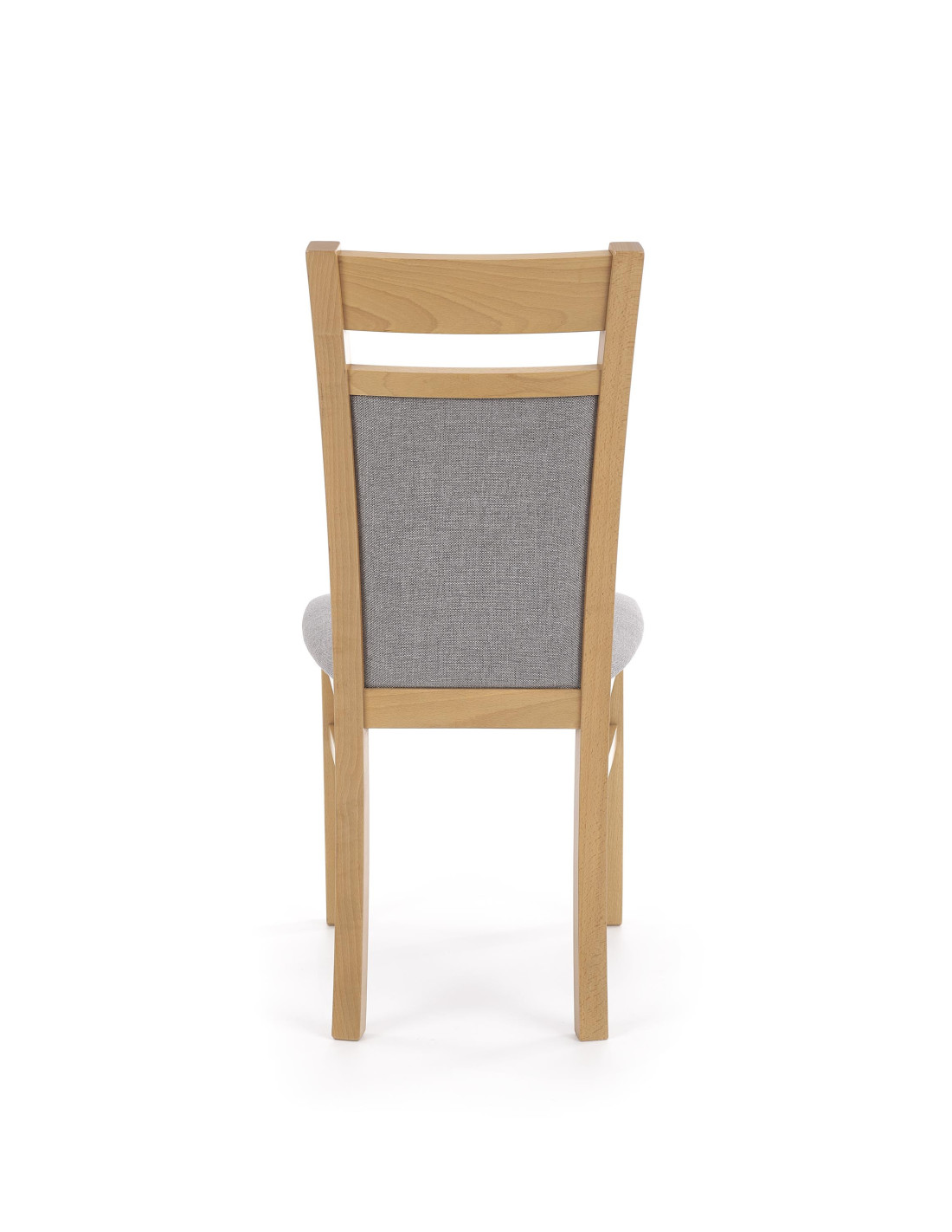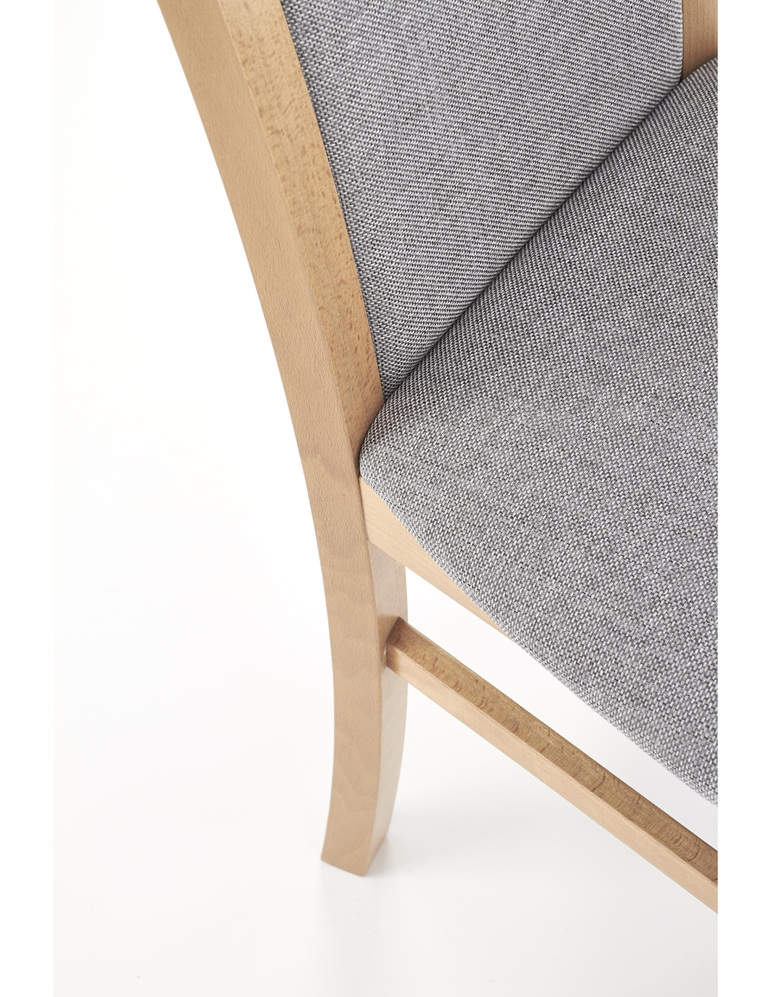 Krzesło wyróżnia się drewnianą konstrukcją w kolorze dębu miodowego oraz eleganckim, szarym tapicerowanym siedziskiem i oparciem.