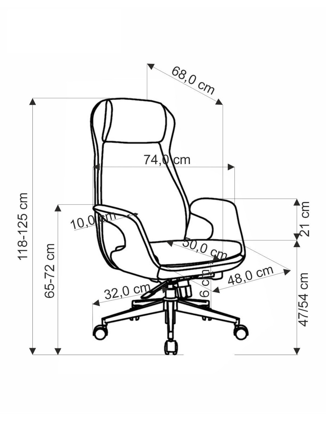 Szerokość wynosi 74 cm, głębokość to 68 cm, a wysokość regulowana jest w zakresie od 118 do 125 cm, z możliwością regulacji wysokości siedziska od 47 do 54 cm.