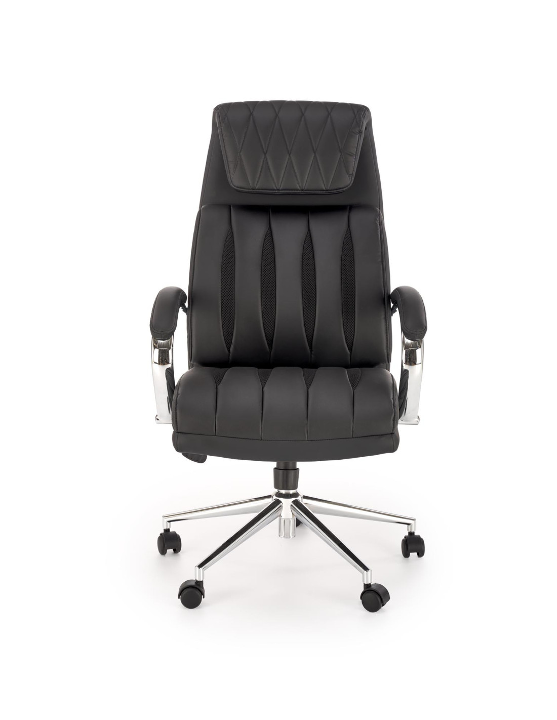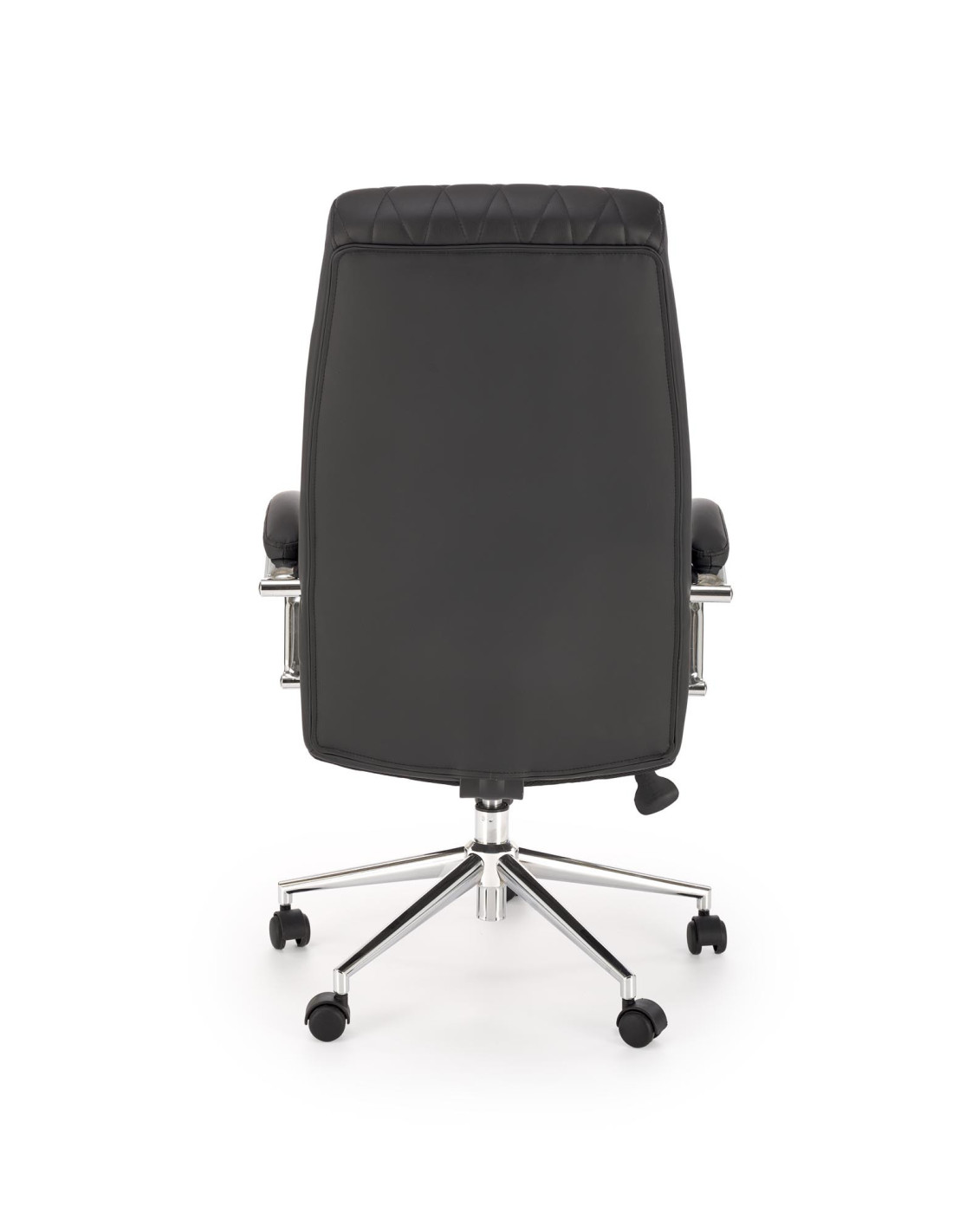Fotel ROMANO ma wysokie oparcie z wyściełanym zagłówkiem, chromowane nogi oraz funkcję regulacji wysokości siedziska, co czyni go ergonomicznym rozwiązaniem dla biura.