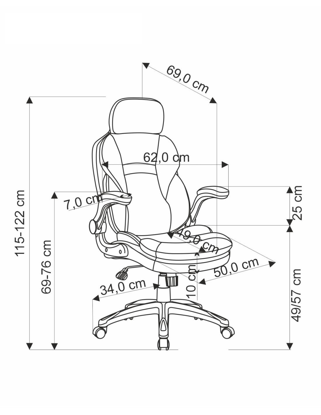 Szerokość wynosi 67 cm, głębokość to 69 cm, a wysokość regulowana od 120 do 128 cm, z możliwością regulacji wysokości siedziska od 49 do 57 cm.