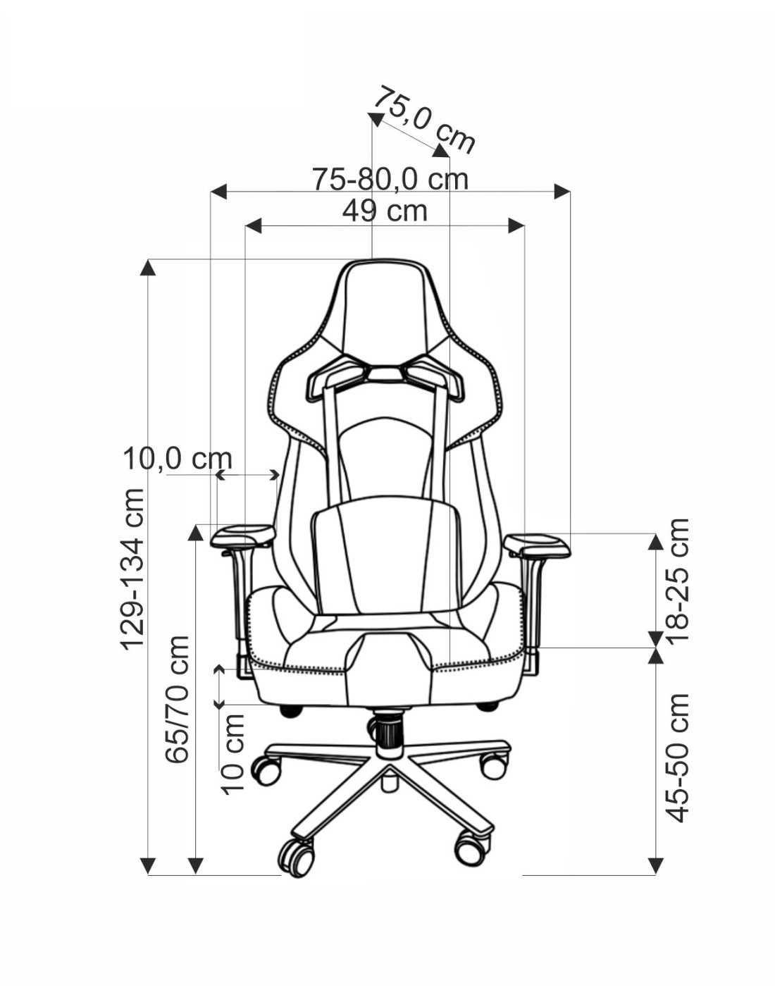 Szerokość wynosi od 75 do 80 cm, głębokość to 75 cm, a wysokość to 129-134 cm, z regulacją wysokości siedziska od 45 do 50 cm.