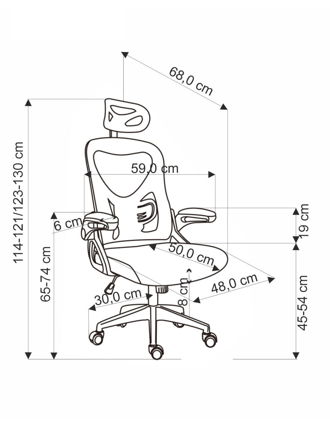 Szerokość wynosi 59 cm, głębokość 63 cm, a wysokość to 123-130 cm, z regulacją wysokości siedziska od 45 do 54 cm.