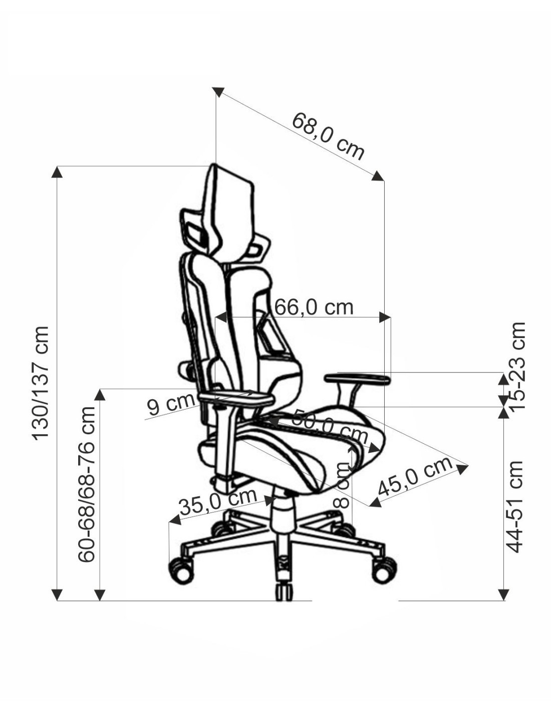 Szerokość wynosi 66 cm, głębokość to 68 cm, a wysokość to 130-137 cm, z możliwością regulacji wysokości siedziska od 44 do 51 cm.
