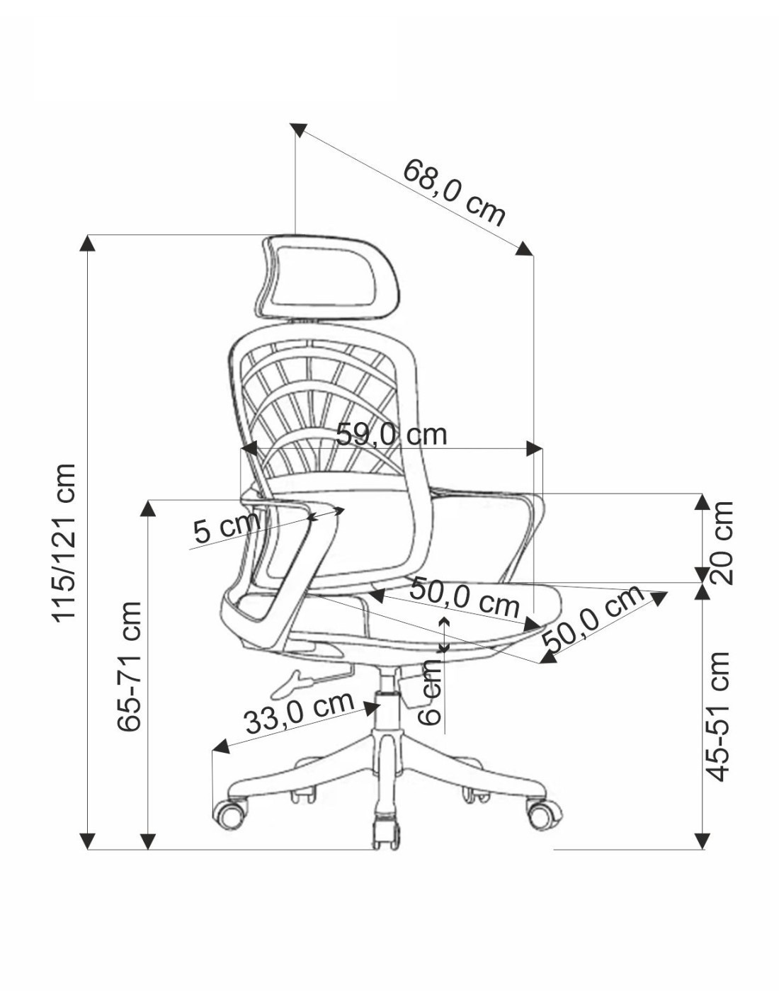 Szerokość wynosi 59 cm, głębokość to 59 cm, a wysokość to 115-121 cm, z możliwością regulacji wysokości siedziska od 45 do 51 cm.