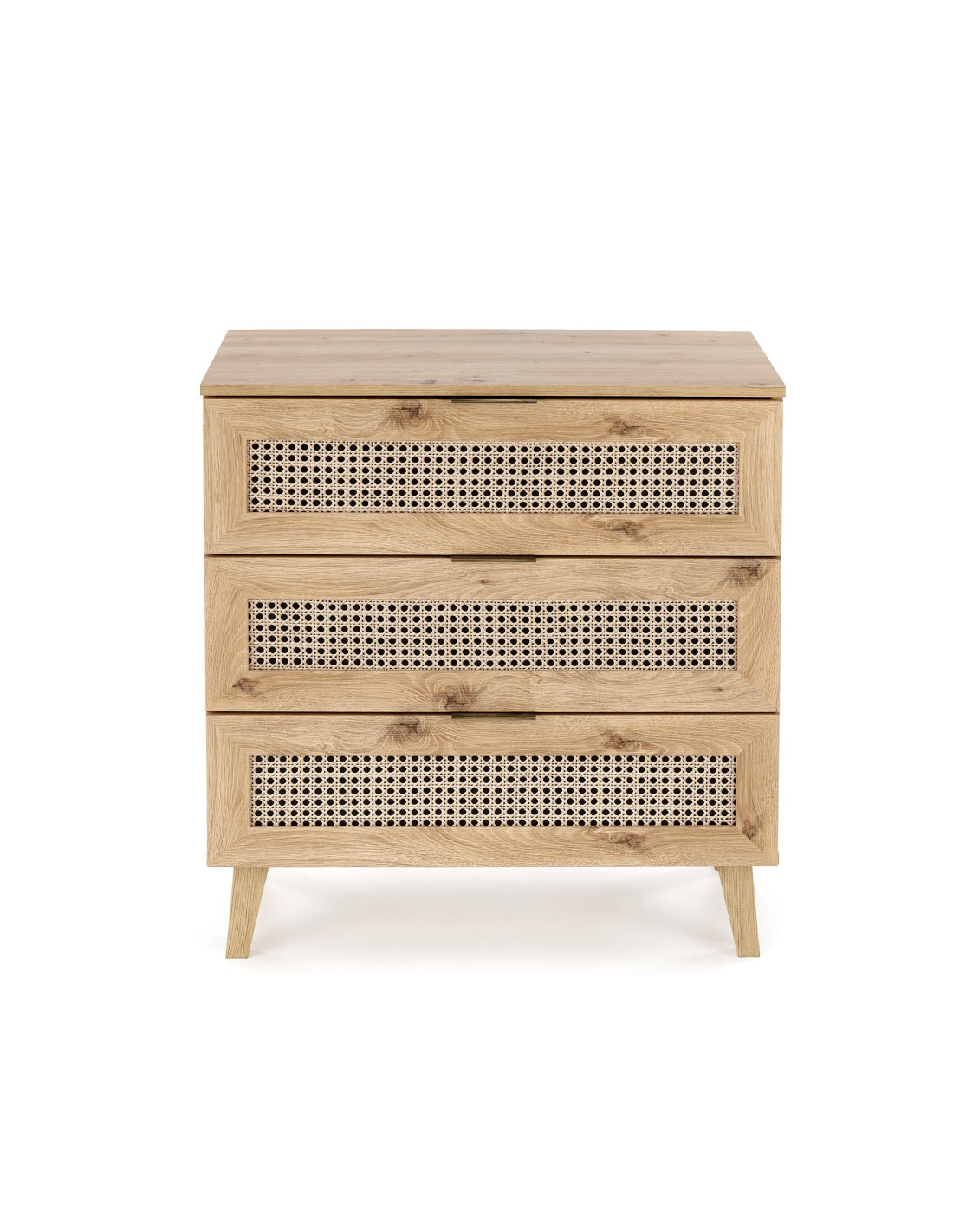 Odkryj komodę BORNEO KM-2 – kompaktowy mebel, który łączy skandynawski minimalizm z boho akcentami. Jej naturalny kolor dąb artisan ociepla przestrzeń, a prostokątna forma świetnie wpasowuje się zarówno w nowoczesne, jak i klasyczne wnętrza. Fronty szuflad zdobi nadruk w stylu plecionki rattanowej – wygląda naturalnie i elegancko, a jednocześnie jest bardziej trwały i łatwy w pielęgnacji niż prawdziwy rattan.