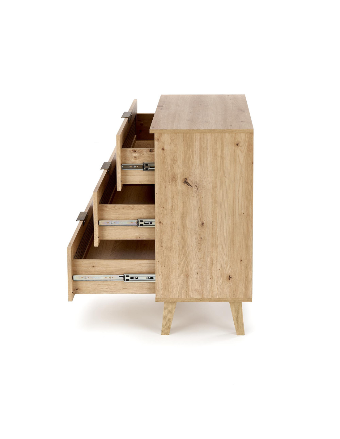 Wyposażona w trzy praktyczne szuflady, komoda BORNEO KM-2 oferuje sporo miejsca na przechowywanie ubrań, dokumentów czy akcesoriów codziennego użytku. Skośne nogi nadają jej lekkości, a solidna konstrukcja z płyt laminowanych i MDF zapewnia stabilność i długowieczność.