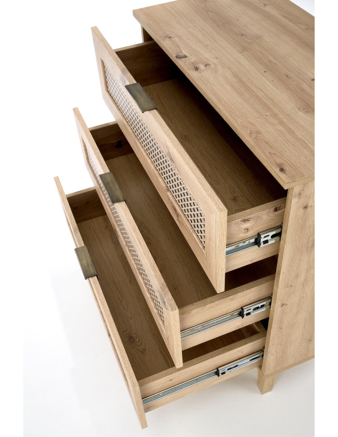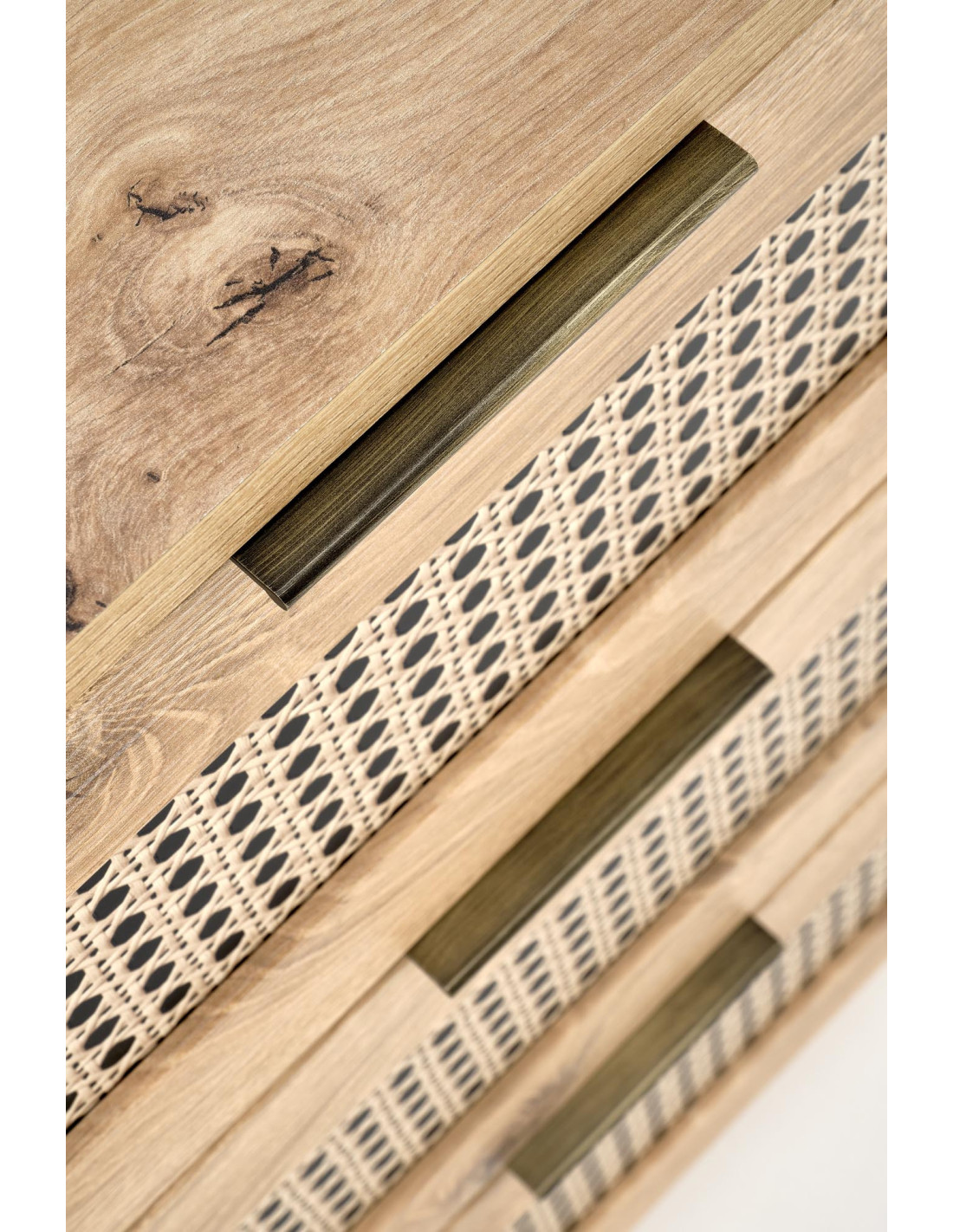 Komoda została wykonana z płyty laminowanej, MDF laminowanego, płyty HDF oraz polipropylenu. Fronty posiadają nadruk w stylu plecionki rattanowej – trwały i efektowny.