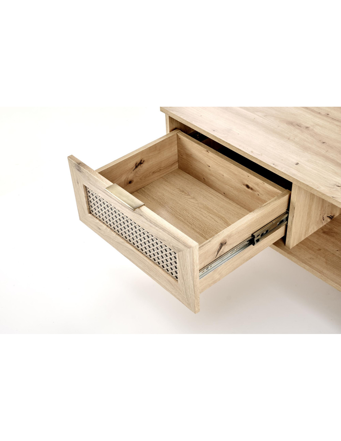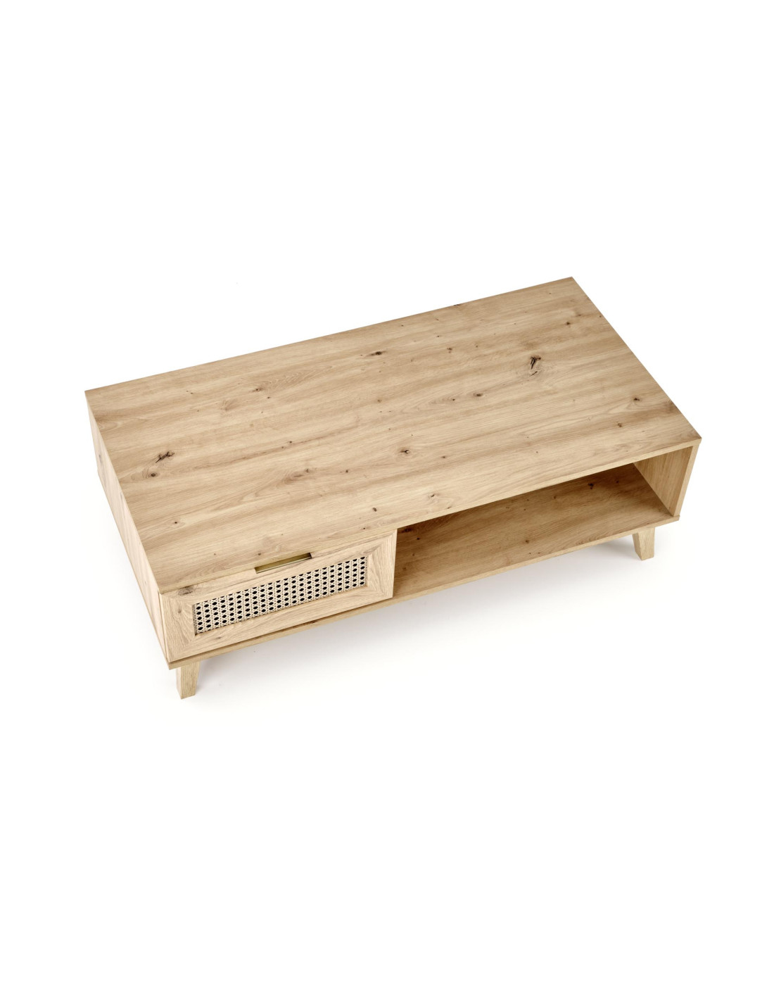Ława BORNEO wykonana jest z płyty laminowanej, MDF laminowanego oraz płyty HDF. Front szuflady zdobi nadruk inspirowany plecionką rattanową.