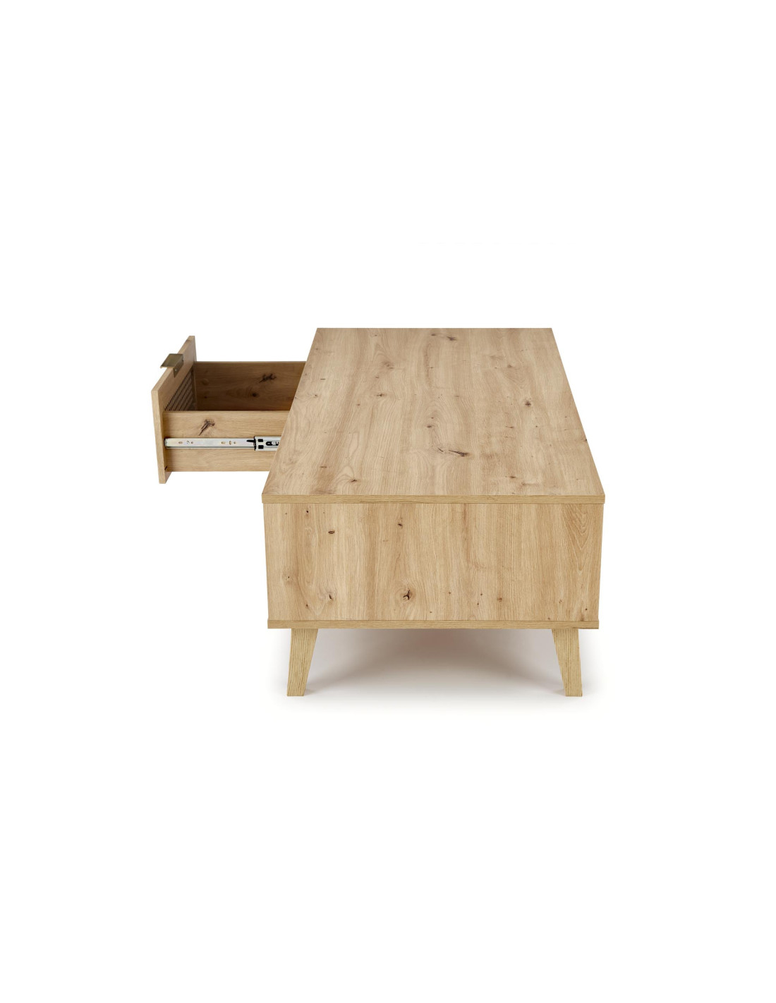Ława została wyposażona w funkcjonalną szufladę oraz otwartą półkę, dzięki czemu zyskujesz miejsce na książki, piloty, gazety czy dekoracje. Stożkowe nogi dodają jej lekkości wizualnej, a przy tym zapewniają stabilność i trwałość. To idealny wybór zarówno do nowoczesnych, jak i klasycznych aranżacji wnętrz.