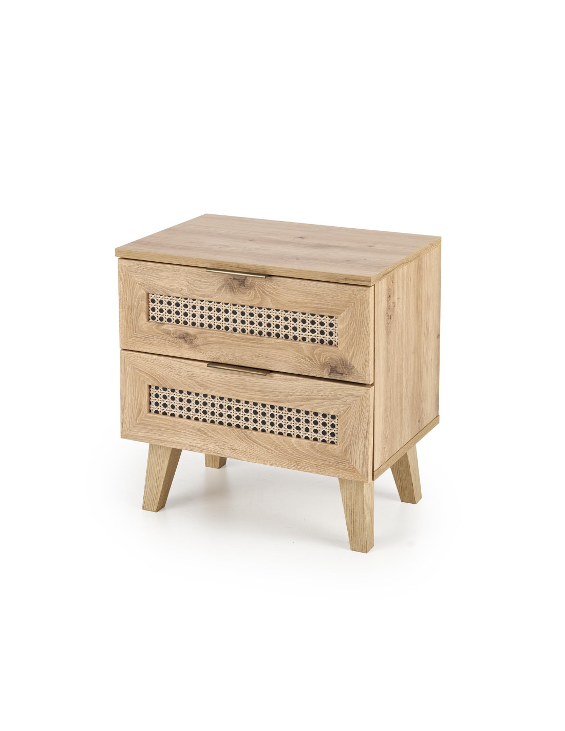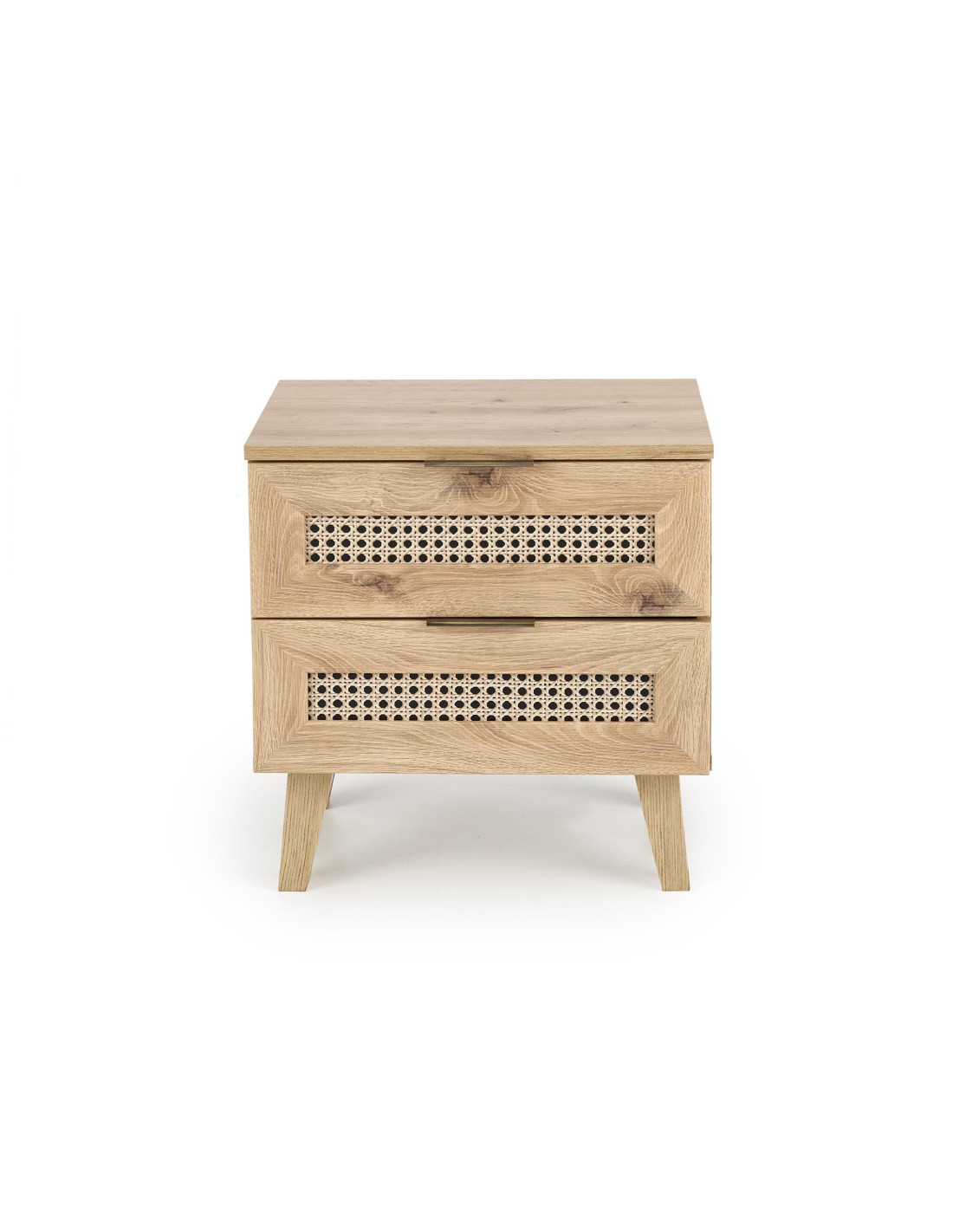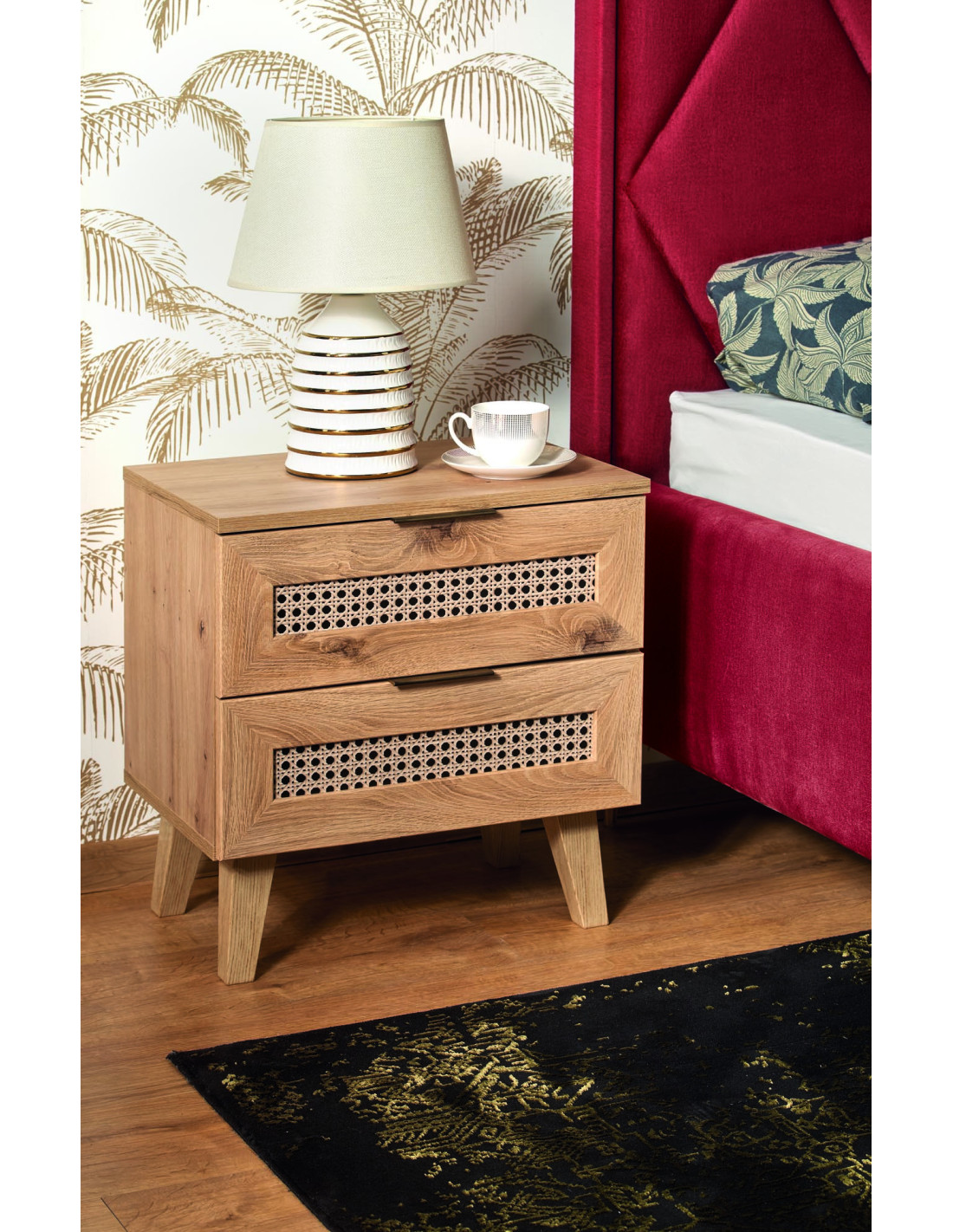 Fronty obu szuflad zdobi nadruk w stylu plecionki rattanowej. Dzięki temu szafka prezentuje się niezwykle lekko i dekoracyjnie, zachowując przy tym trwałość i łatwość w pielęgnacji. Stabilne, lekko rozstawione nóżki podkreślają nowoczesny charakter i nadają meblowi wizualnej lekkości, dzięki czemu szafka doskonale uzupełni wystrój każdej sypialni.