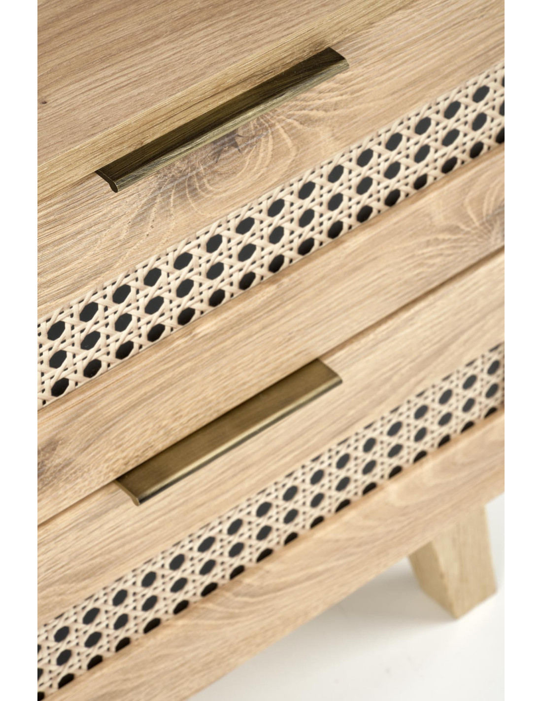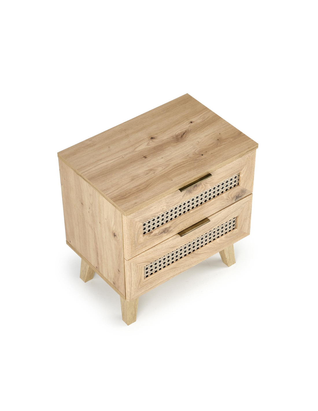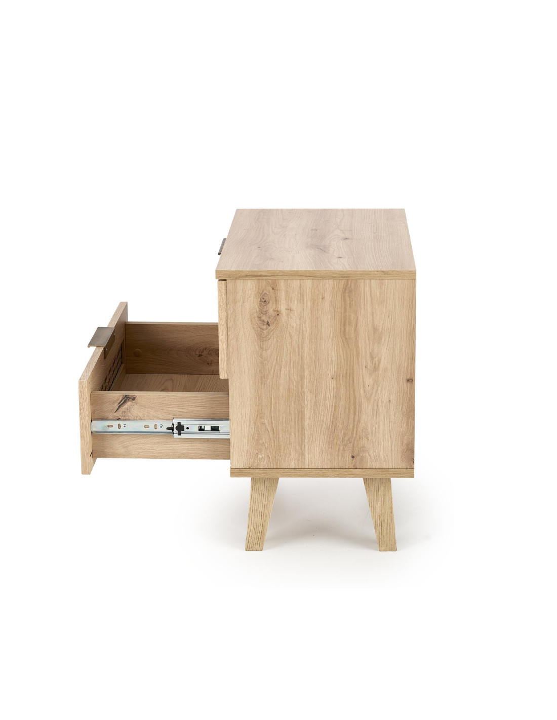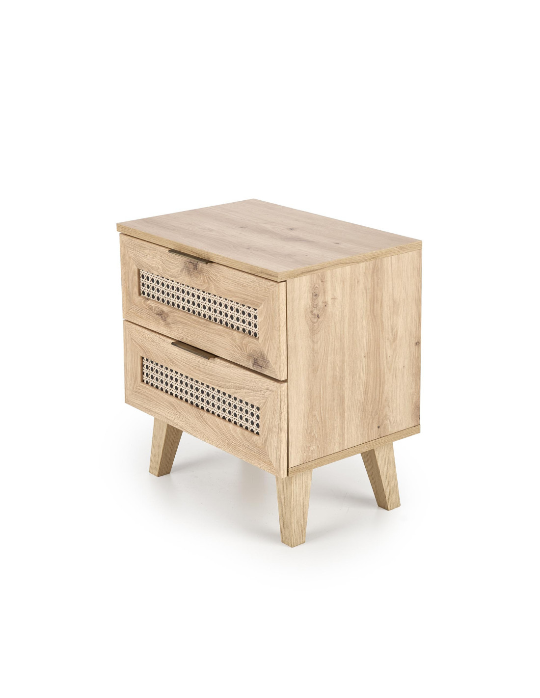 Fronty obu szuflad zdobi nadruk w stylu plecionki rattanowej. Dzięki temu szafka prezentuje się niezwykle lekko i dekoracyjnie, zachowując przy tym trwałość i łatwość w pielęgnacji. Stabilne, lekko rozstawione nóżki podkreślają nowoczesny charakter i nadają meblowi wizualnej lekkości, dzięki czemu szafka doskonale uzupełni wystrój każdej sypialni.