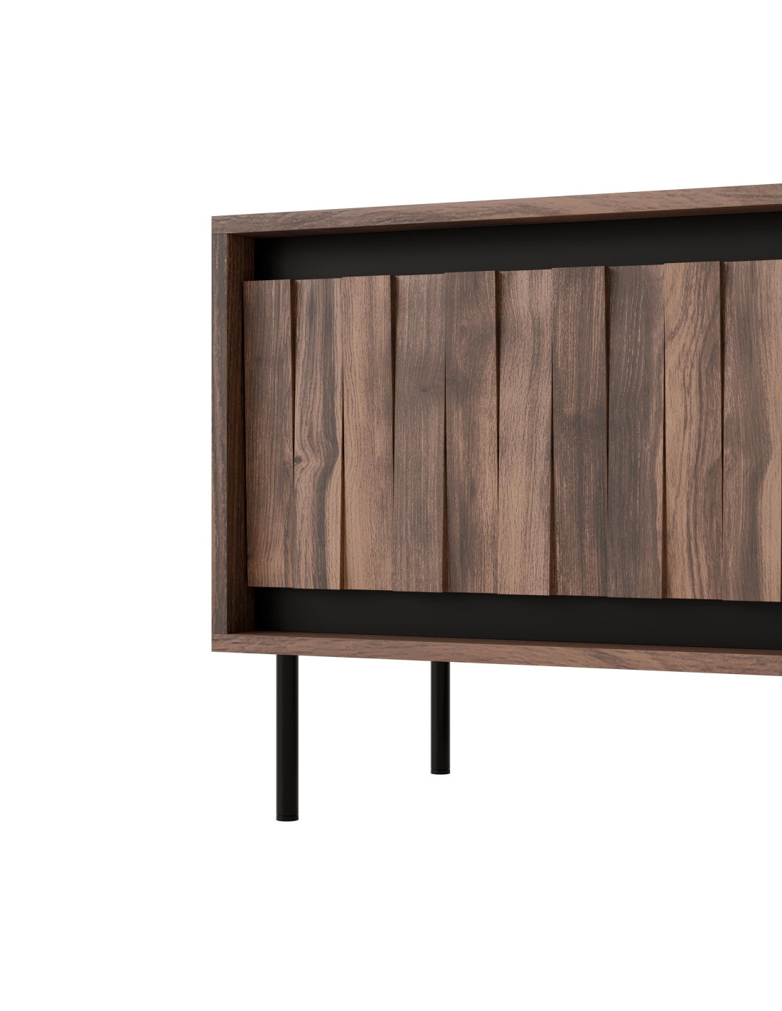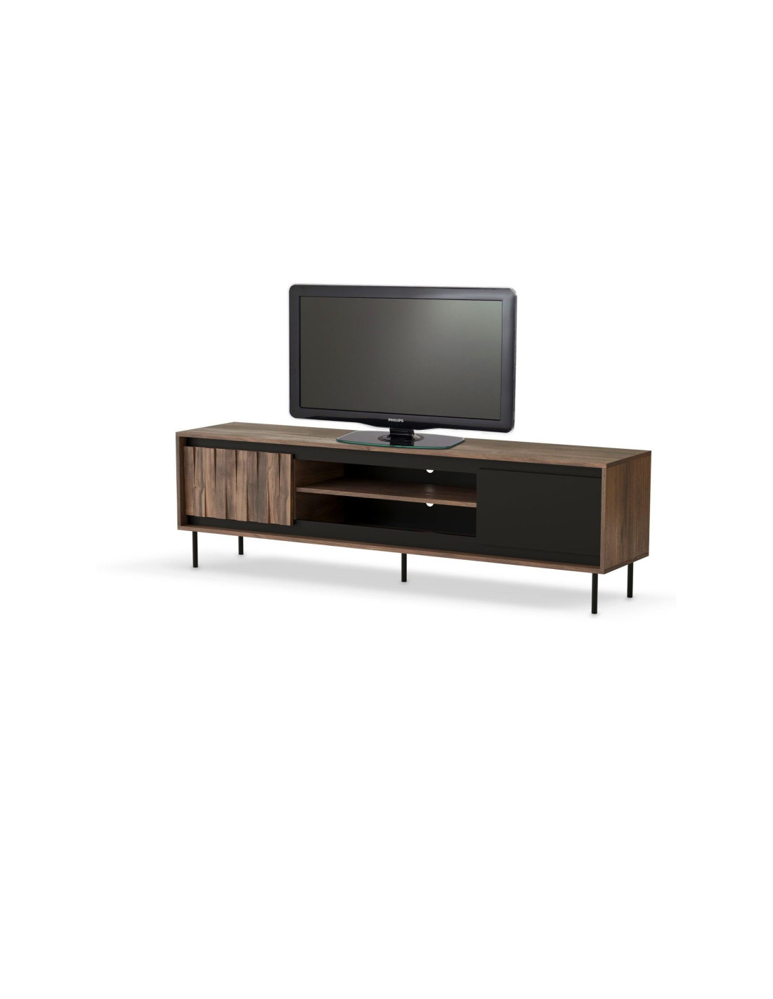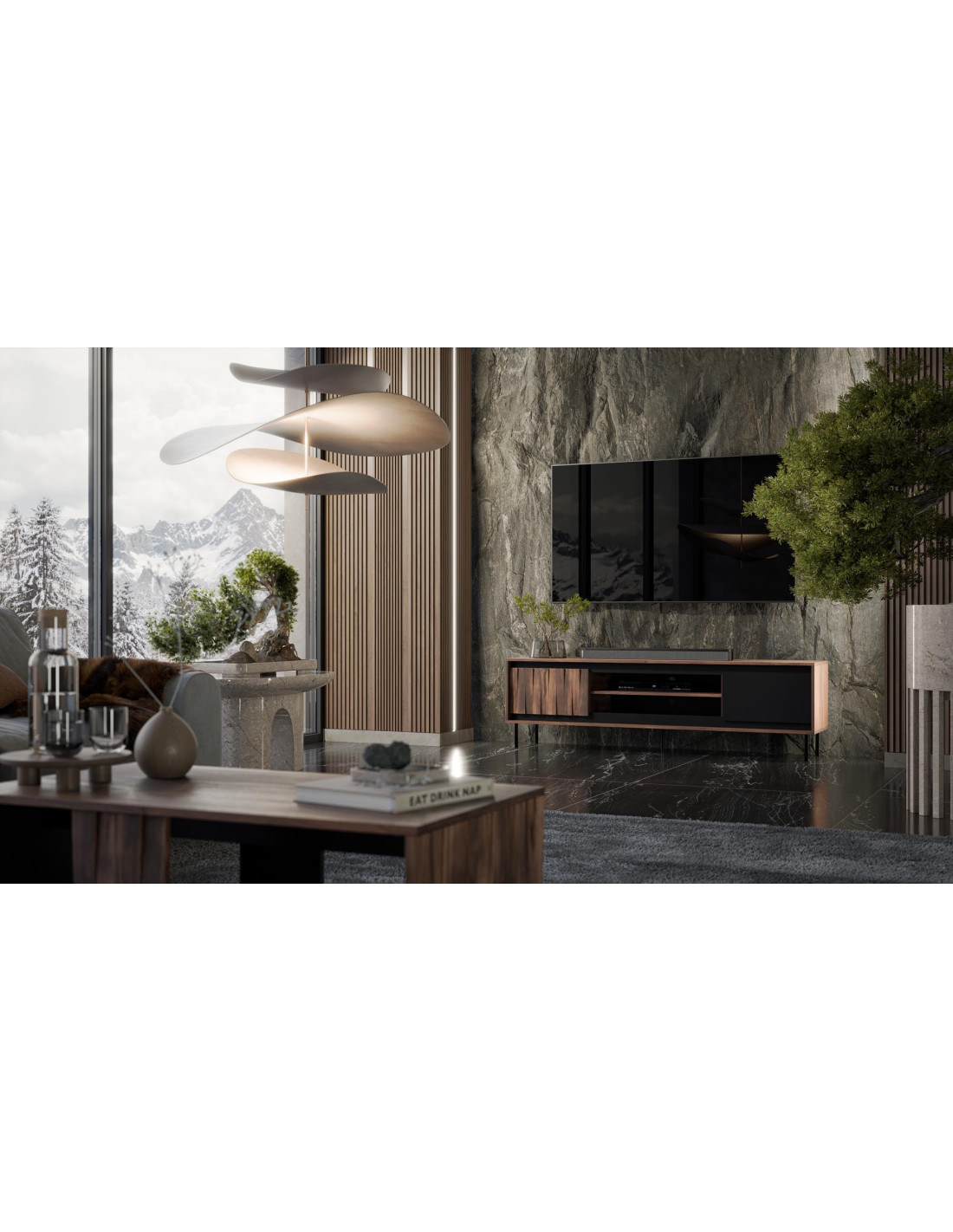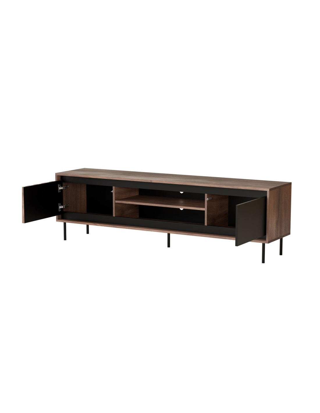 Z dwoma drzwiami oraz dwiema praktycznymi półkami, stolik RTV SWING zapewnia mnóstwo miejsca na wszystkie Twoje multimedia oraz dekoracje. Czarne stalowe nogi nie tylko dodają mu charakteru, ale także gwarantują stabilność, co czyni go doskonałym wyborem do nowoczesnych wnętrz.