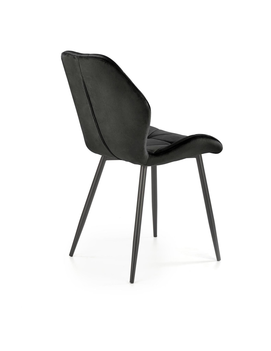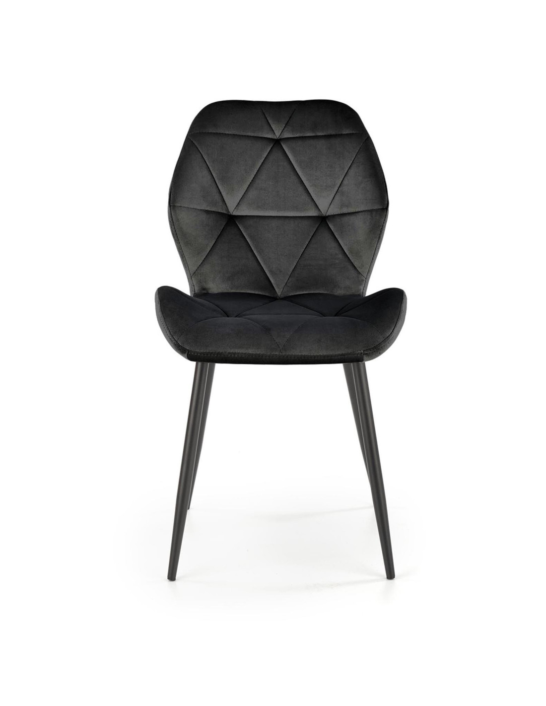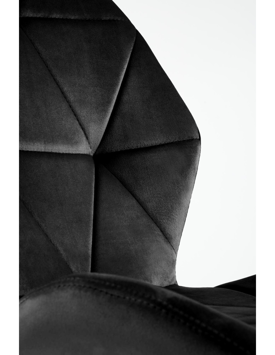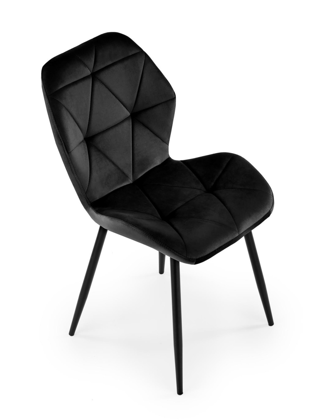 Krzesło K453 charakteryzuje się geometrycznymi przeszyciami oraz luksusową tkaniną velvet w kolorze czarnym.