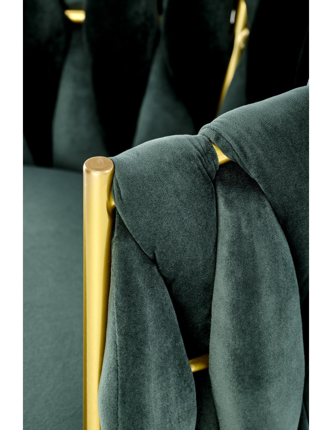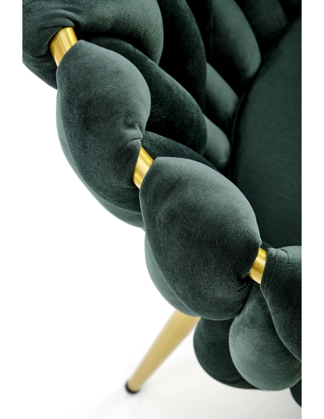 Krzesło K517 wykonane jest z ciemnozielonego aksamitu (weluru) oraz stali malowanej proszkowo w kolorze złotym.