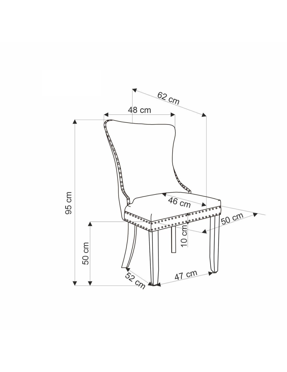 Szerokość wynosi 50 cm, głębokość 62 cm, a wysokość to 95 cm, z wysokością siedziska wynoszącą 50 cm.