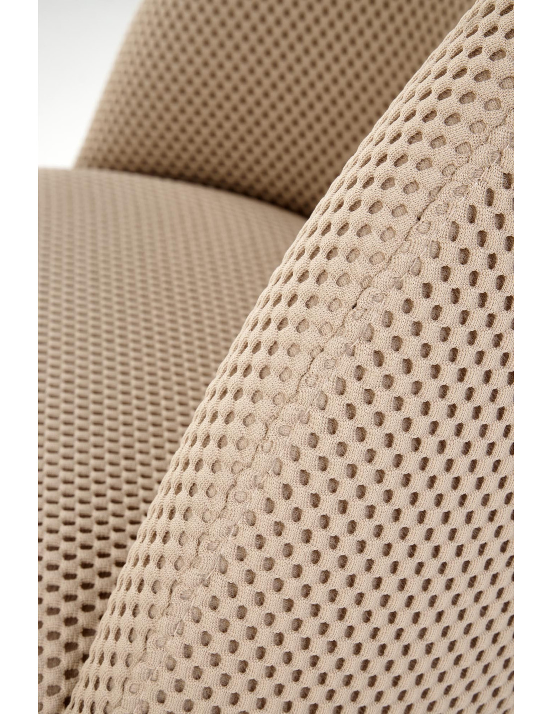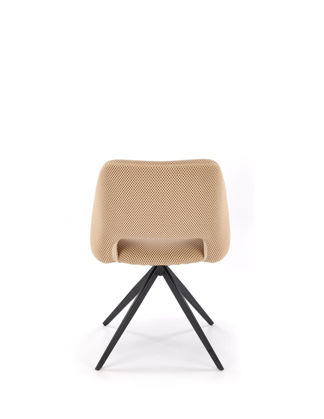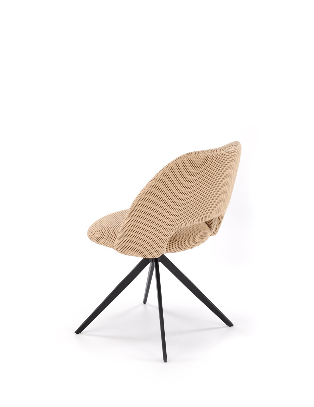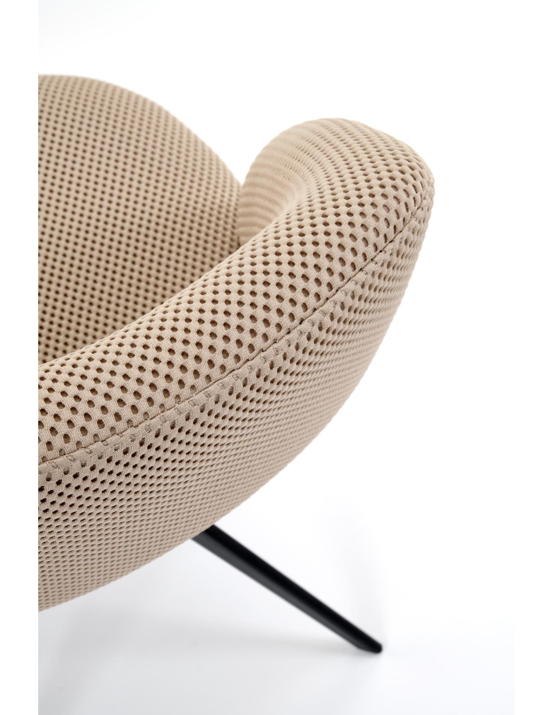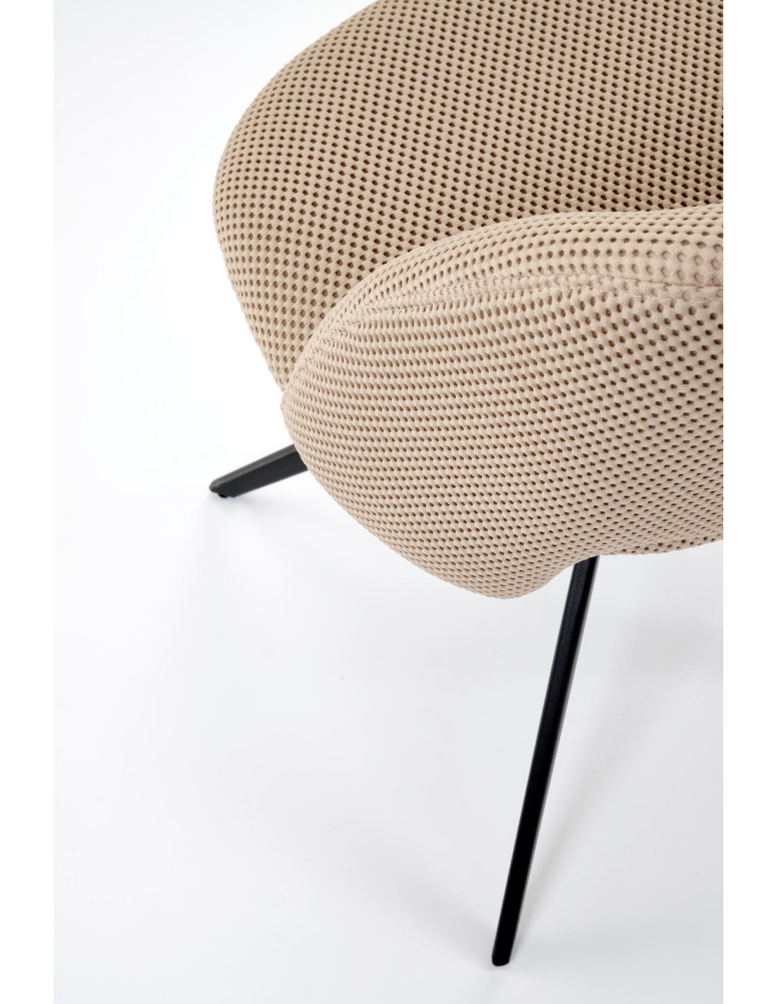 Czarna, stalowa podstawa, rozchodząca się w cztery strony, gwarantuje stabilność i bezpieczeństwo. Zaokrąglone kształty siedziska i oparcia podkreślają nowoczesny charakter mebla, który doskonale wkomponuje się w każdą aranżację.