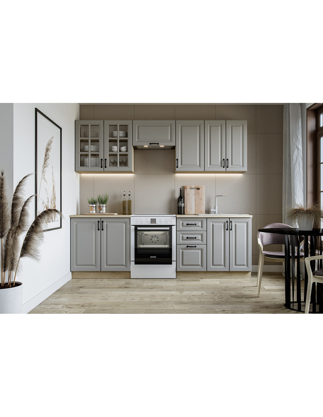 Ciesz się wyjątkowym designem! Zestaw kuchenny ELIZABETH to wspaniałe połączenie elegancji i funkcjonalności, które odmieni Twoją kuchnię. Z długością 240 cm, ten zestaw wyróżnia się frontami w kolorze popielatym, które wspaniale kontrastują z ciepłym odcieniem dębu sonoma. Klasyczne fronty z frezowanym wzorem oraz przeszklone górne szafki nadają mu wyjątkowego charakteru, a czarne metalowe uchwyty dodają nowoczesnego sznytu.