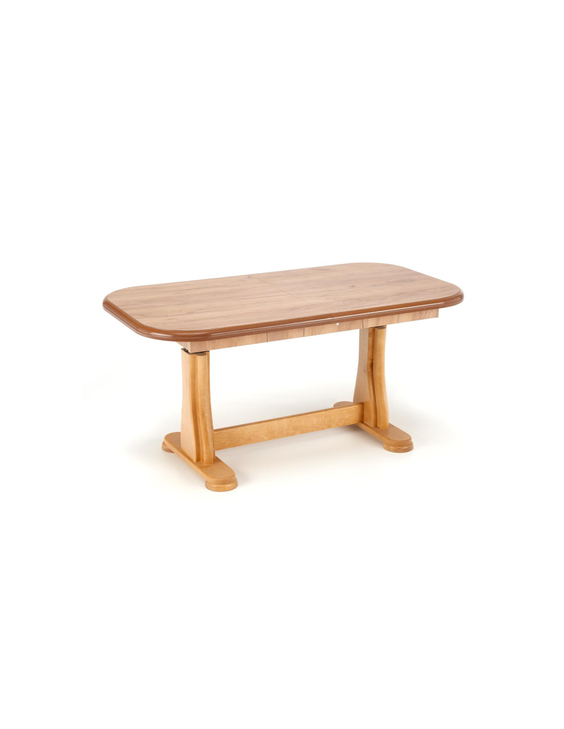Stół TYMON wyróżnia się rozkładanym blatem z MDF laminowanego, zaokrąglonymi rogami oraz solidnymi nogami z drewna bukowego.