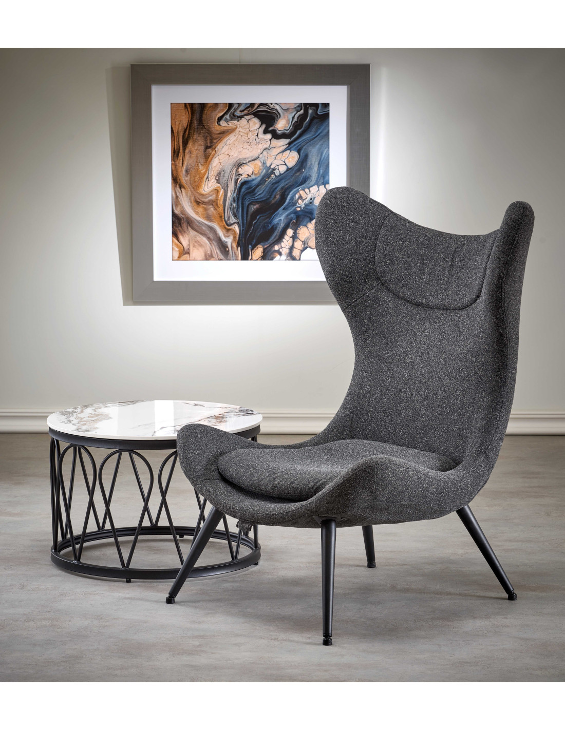 Zainwestuj w stylowe rozwiązanie i poznaj fotel ATLANTIS, który łączy nowoczesny design z elegancją. Jego antracytowy kolor nadaje mu niepowtarzalny charakter, a miękkie, zaokrąglone kształty oraz wygodne poduszki sprawiają, że każda chwila spędzona w tym fotelu to prawdziwa przyjemność. Wysokie, profilowane oparcie z delikatnymi "uszami" po bokach zapewnia odpowiednie wsparcie, a smukłe czarne nogi dodają lekkości całej konstrukcji.